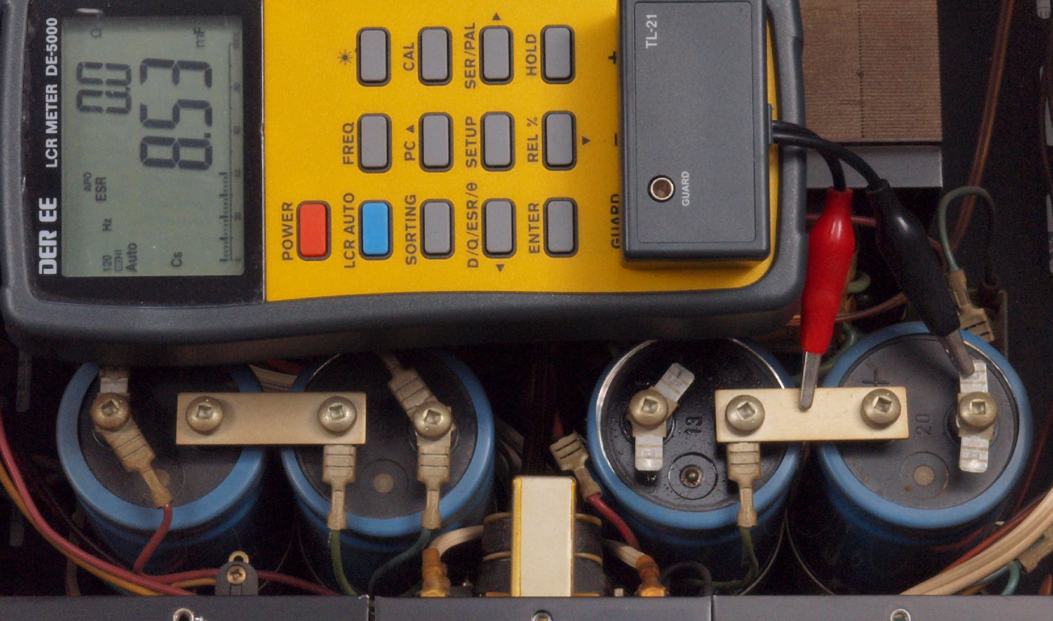 | A42. 点検中 R側+電源ブロック電解コンデンサー測定=7600μF、ESR=0.0Ω。 ESRに付いてはmuRata、Nichicon、ルビコン、Panasonic、日本ケミコン(株)参照。 この測定でNGな物はダメですが、負荷試験方が正確です。 |