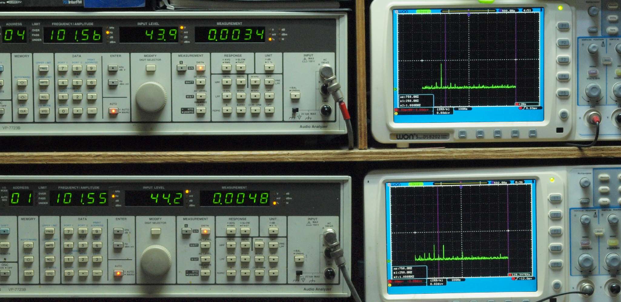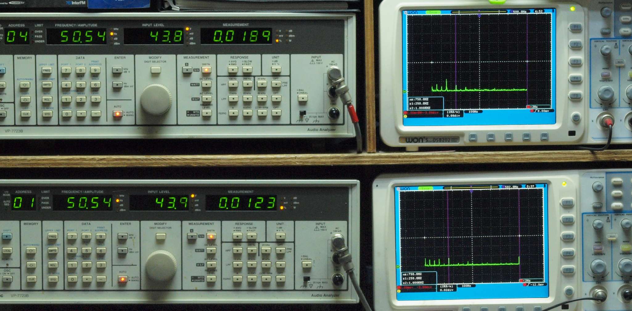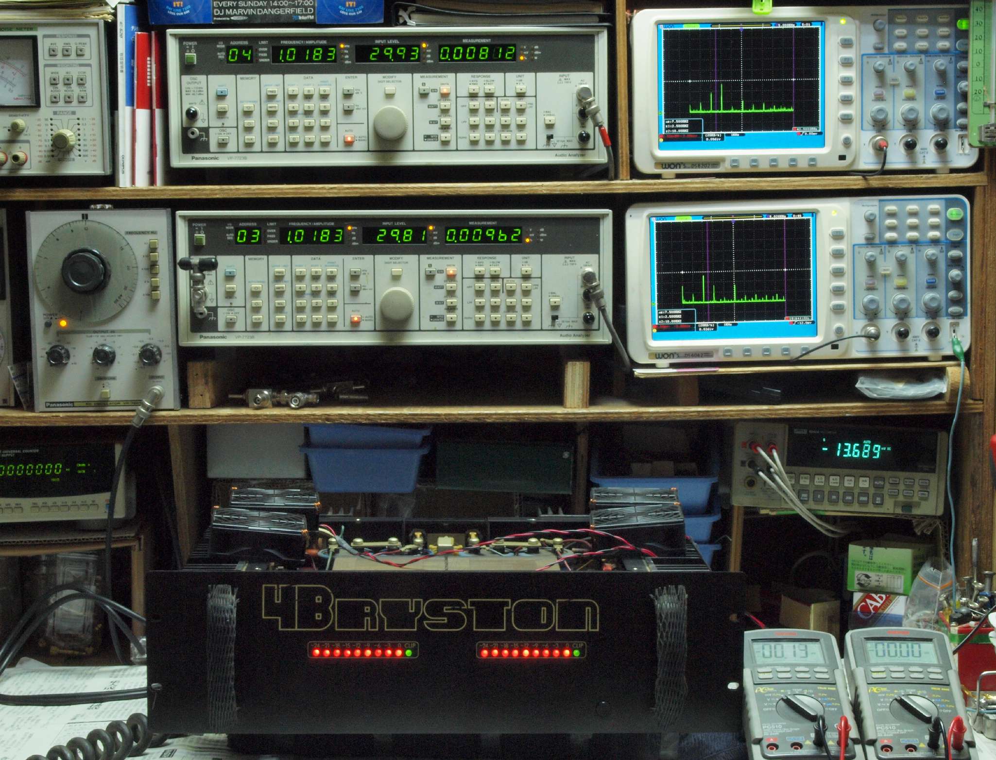 | E. 測定・調整。 画像をクリックすると、大きく(横幅2050ドット)表示されます。 E0. 出力・歪み率測定・調整 「見方」。 上段中 右側SP出力を「Audio Analyzer Panasonic VP−7723B」により測定。 表示LED、 左端=メモリーNo、 中左=周波数測定、 中右=出力電圧測定、 右端=歪み率測定。 上段右端 VP−7723Bの基本波除去出力を「owon SDS8202(200MHZ)」で「FFT分析」表示。 下段中 左側SP出力を「Audio Analyzer Panasonic VP−7723B」により測定。 表示LED、 左端=メモリーNo、 中左=周波数測定、 中右=出力電圧測定、 右端=歪み率測定。 下段右端 VP−7723Bの基本波除去出力を「owon SDS6062(200MHZ)」で「FFT分析」表示。 下段左端 オーディオ発振器 VP−7201A より50Hz〜100kHzの信号を出し(歪み率=約0.003%)、ATT+分配器を通し、AMPに入力。 よって、ダイアル設定出力レベルより低くなります。測定機器の仕様や整備の様子はこちら、「VP−7723B」「VP−7201A」。 FFT画面の見方はこちら。 |