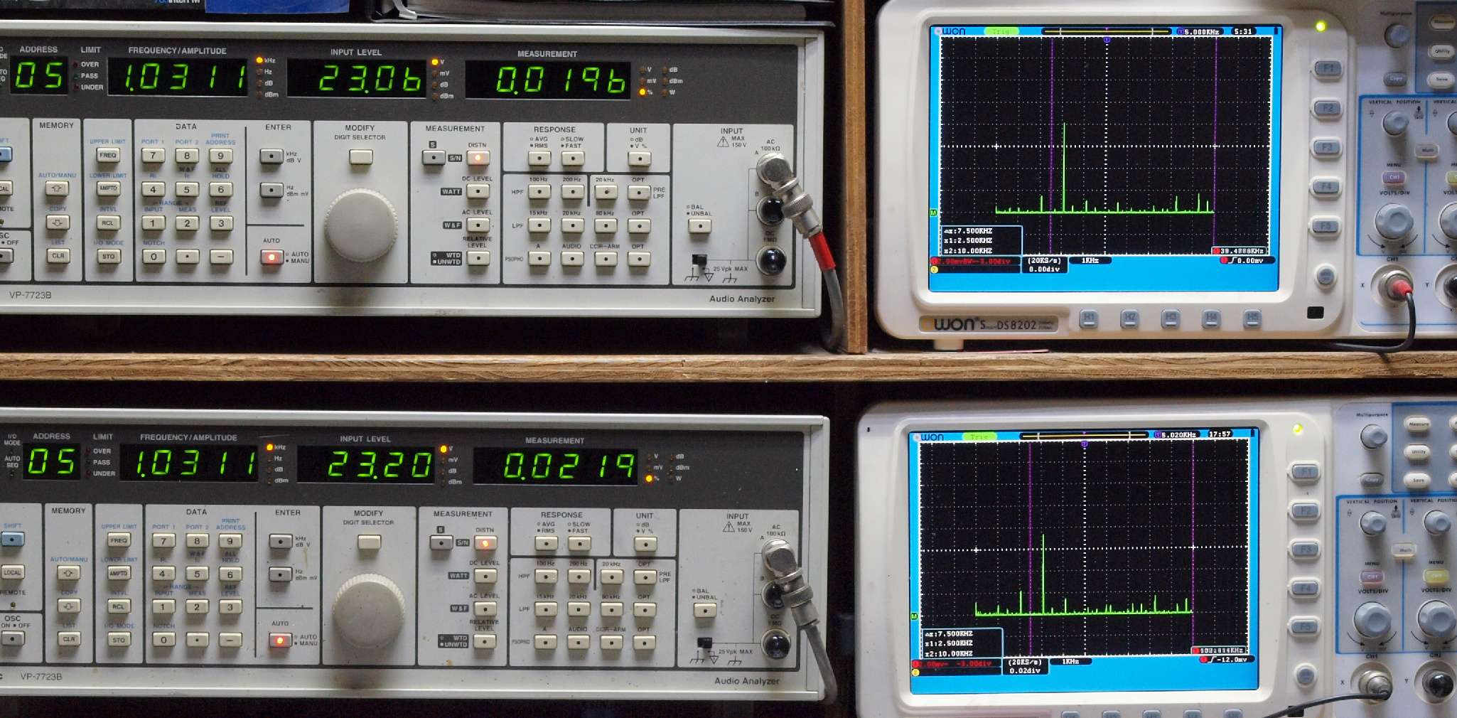 | E. 測定・調整。 画像をクリックすると、大きく(横幅2050ドット)表示されます。 E0. 出力・歪み率測定・調整。 電源はAC100Vで測定。 「見方」。 上段中 右側SP出力を「Audio Analyzer Panasonic VP−7723B」により測定。 表示LED、 左端=メモリーNo、 中左=周波数測定、 中右=出力電圧測定、 右端=歪み率測定。 上段右端 VP−7723Bの基本波除去出力を「owon SDS8202(200MHZ)」で「FFT分析」表示。 下段中 左側SP出力を「Audio Analyzer Panasonic VP−7723B」により測定。 表示LED、 左端=メモリーNo、 中左=周波数測定、 中右=出力電圧測定、 右端=歪み率測定。 下段右端 VP−7723Bの基本波除去出力を「owon SDS6062(200MHZ)」で「FFT分析」表示。 下段左端 オーディオ発振器 VP−7201A より50Hz〜100kHzの信号を出し(歪み率=約0.003%)、ATT+分配器を通し、AMPに入力。 よって、ダイアル設定出力レベルより低くなります。測定機器の仕様や整備の様子はこちら、「VP−7723B」「VP−7201A」。 FFT画面の見方はこちら。 |