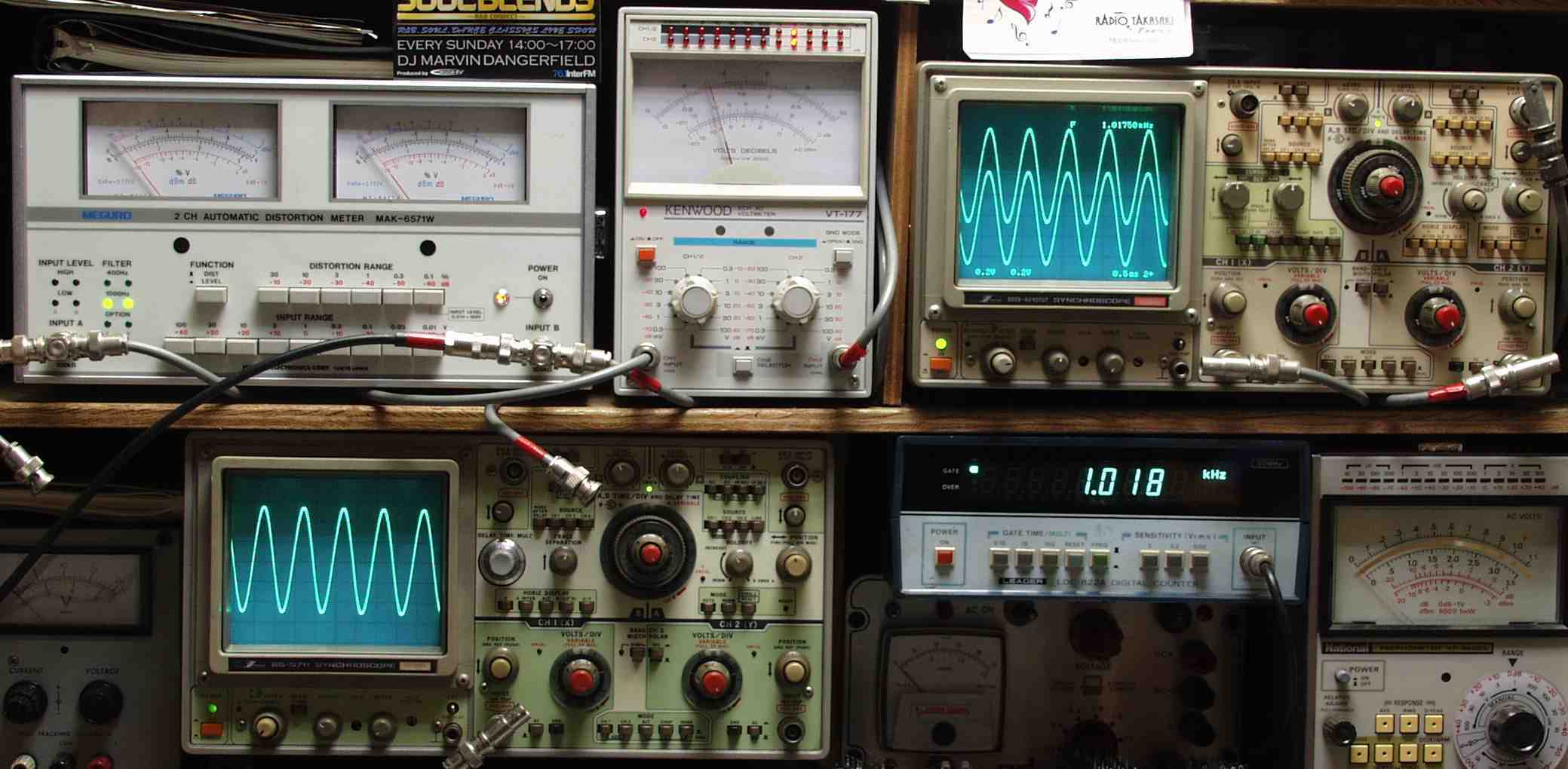 | E. 調整・測定。 画像をクリックすると、大きく(横幅2050ドット)表示されます。 E1A. 出力/歪み測定・調整 <見方> 下左オーデオ発振器より400HZ・1KHZの信号を出す(歪み率=約0.003%) 下中=入力波形(オーデオ発振器のTTLレベル) 下右=周波数計 上左=SP出力の歪み率測定 左メータ=L出力、右メータ=R出力 上中=SP出力電圧測定器、赤針=R出力、黒針=L出力 上右=SP出力波形オシロ 上=R出力、下=L出力(出力電圧測定器の出力) |