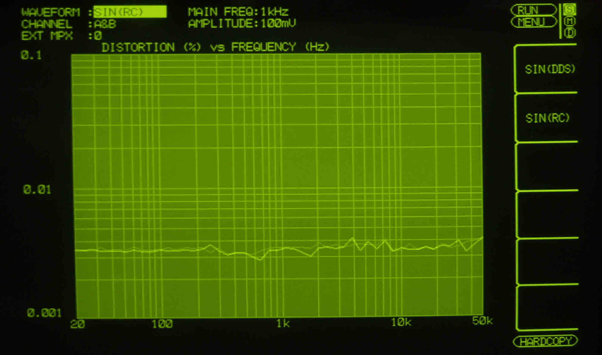 | E1B. 出力=10Vの出力でも飽和しない! 歪み率=0.01% AUX入力 1000HZ このAMPは入力ジャックの抜き差し等は、十分注意する事。ミスをするとメインAMPやSPを壊します。 |