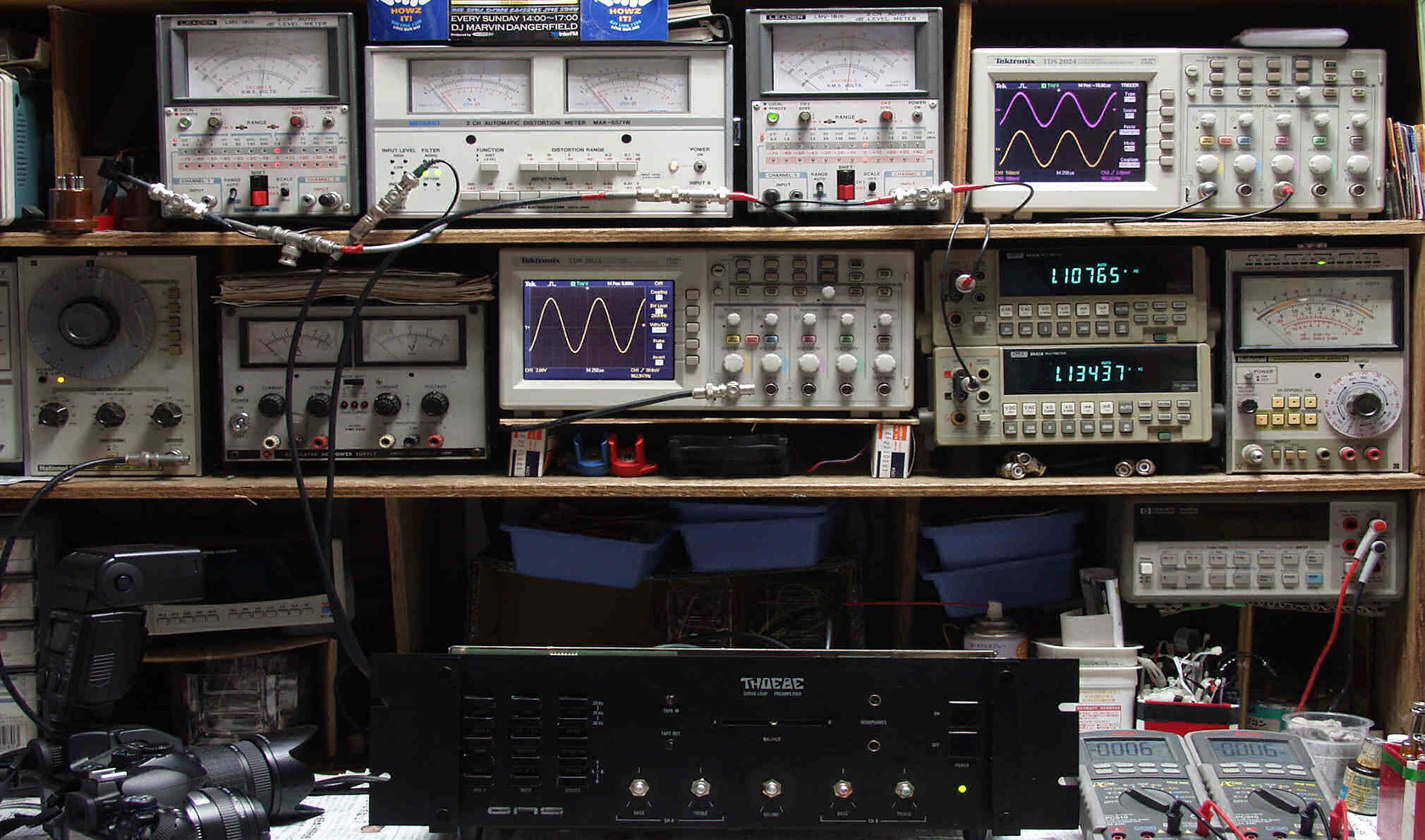 | E. 調整・測定 E1. 出力・歪み率測定・調整 <見方> 下段左端 オーディオ発振器より400HZ・1KHZの信号を出し(歪み率=約0.003%)これをAMPに入力し、出力を測定 下段中左 オシロ=入力波形(オーディオ発振器のTTLレベル) 下段中右上=周波数計 上段左端 電圧計=L側出力電圧測定、黒針のみ使用 上段中左 歪み率計=出力の歪み率測定 左メータ=L出力、右メータ=R出力 上段中右 電圧計=R側出力電圧測定、赤針のみ使用 上段右端 オシロ=出力波形 上=R出力、下=L出力(実際にはRL電圧計の出力「Max1V」を観測) 下段中右上 デジタル電圧計=R出力電圧測定 下段中右下 デジタル電圧計=L出力電圧測定 |