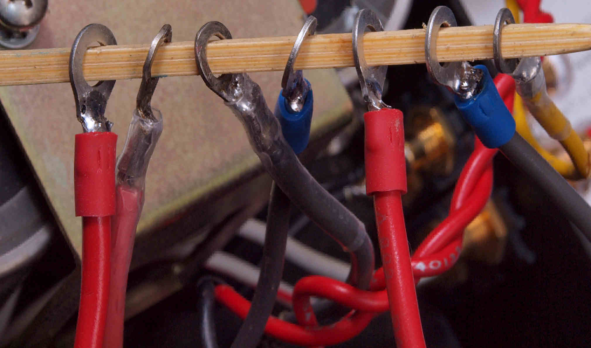 | C88. 修理中 電源SW配線。 Y型圧着端子は切り詰めてある サイドに固定されていない所にY型端子を使用すると、Y型端子が開いてしまうので、使用は注意。 |