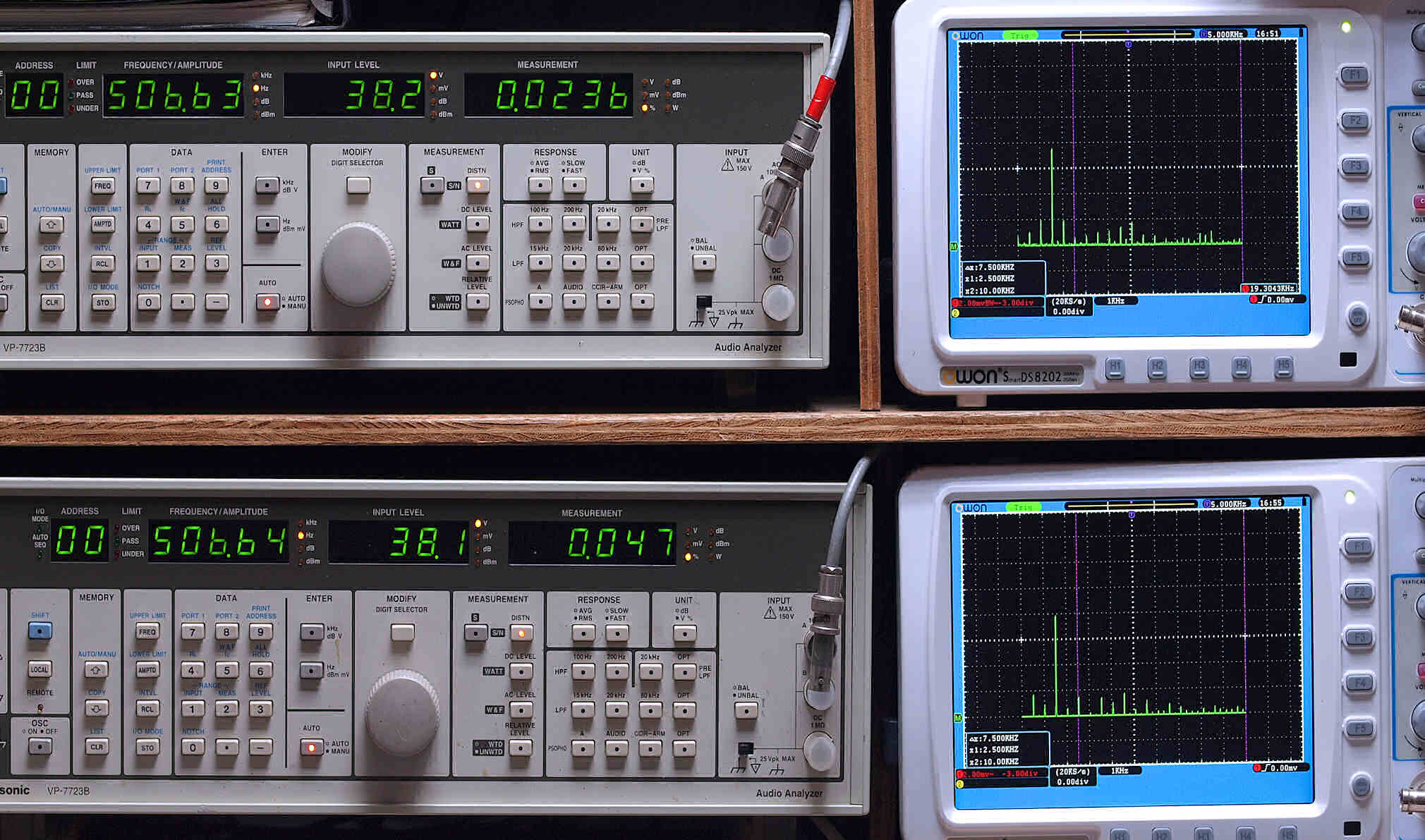 | T. バラック修理後の測定。 画像をクリックすると、大きく(横幅2050ドット)表示されます。 T1. 出力・歪み率測定・調整 「見方」。 上段中 右側SP出力を「Audio Analyzer Panasonic VP−7723B」により測定。 表示LED、 左端=メモリーNo、 中左=周波数測定、 中右=出力電圧測定、 右端=歪み率測定。 上段右端 VP−7723Bの基本波除去出力を「owon SDS8202(200MHZ)」で「FFT分析」表示。 下段中 左側SP出力を「Audio Analyzer Panasonic VP−7723B」により測定。 表示LED、 左端=メモリーNo、 中左=周波数測定、 中右=出力電圧測定、 右端=歪み率測定。 下段右端 VP−7723Bの基本波除去出力を「owon SDS6062(200MHZ)」で「FFT分析」表示。 下段左端 オーディオ発振器 VP−7201A より50Hz〜100kHzの信号を出し(歪み率=約0.003%)、ATT+分配器を通し、AMPに入力。 よって、ダイアル設定出力レベルより低くなります。測定機器の仕様や整備の様子はこちら、「VP−7723B」「VP−7201A」。 FFT画面の見方はこちら。 |