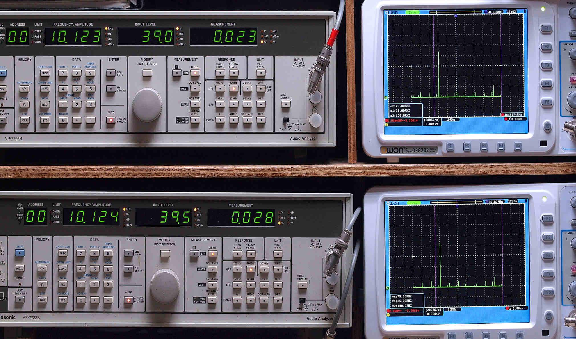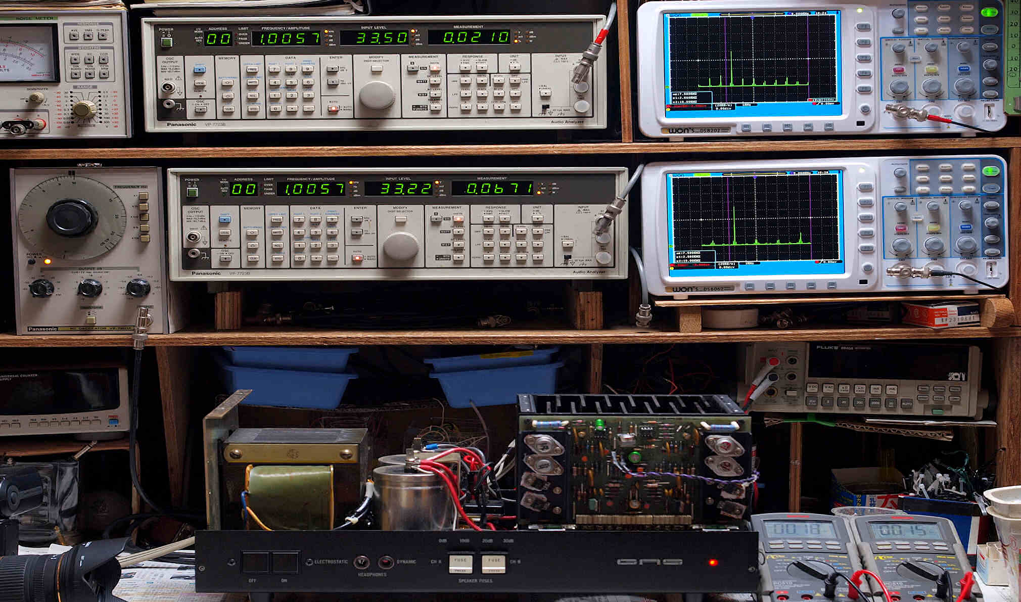 | E. 調整・測定。 画像をクリックすると、大きく(横幅2050ドット)表示されます。 E1. 出力・歪み率測定・調整 「見方」。 上段中 右側SP出力を「Audio Analyzer Panasonic VP−7723B」により測定。 表示LED、 左端=メモリーNo、 中左=周波数測定、 中右=出力電圧測定、 右端=歪み率測定。 上段右端 VP−7723Bの基本波除去出力を「owon SDS8202(200MHZ)」で「FFT分析」表示。 下段中 左側SP出力を「Audio Analyzer Panasonic VP−7723B」により測定。 表示LED、 左端=メモリーNo、 中左=周波数測定、 中右=出力電圧測定、 右端=歪み率測定。 下段右端 VP−7723Bの基本波除去出力を「owon SDS6062(200MHZ)」で「FFT分析」表示。 下段左端 オーディオ発振器 VP−7201A より50Hz〜100kHzの信号を出し(歪み率=約0.003%)、ATT+分配器を通し、AMPに入力。 よって、ダイアル設定出力レベルより低くなります。測定機器の仕様や整備の様子はこちら、「VP−7723B」「VP−7201A」。 FFT画面の見方はこちら。 |