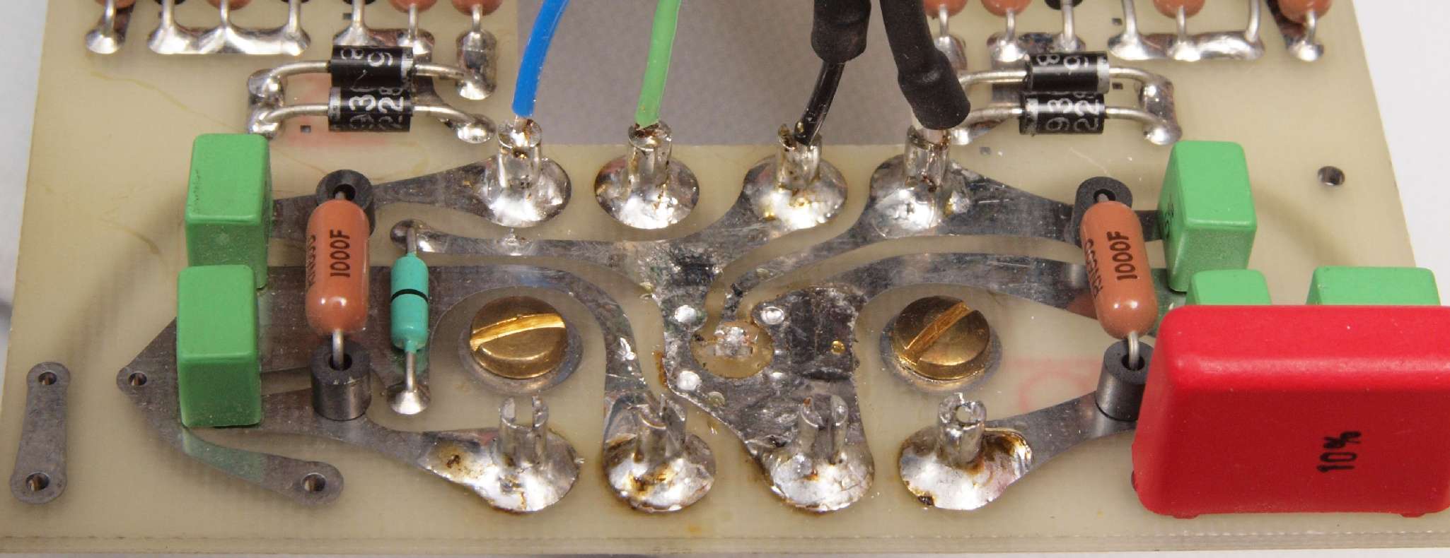 C52. 修理(半田補正)後 左側SP接続端子裏プロテクト基板。電解コンデンサー3個交換、 半田を全部やり直す。