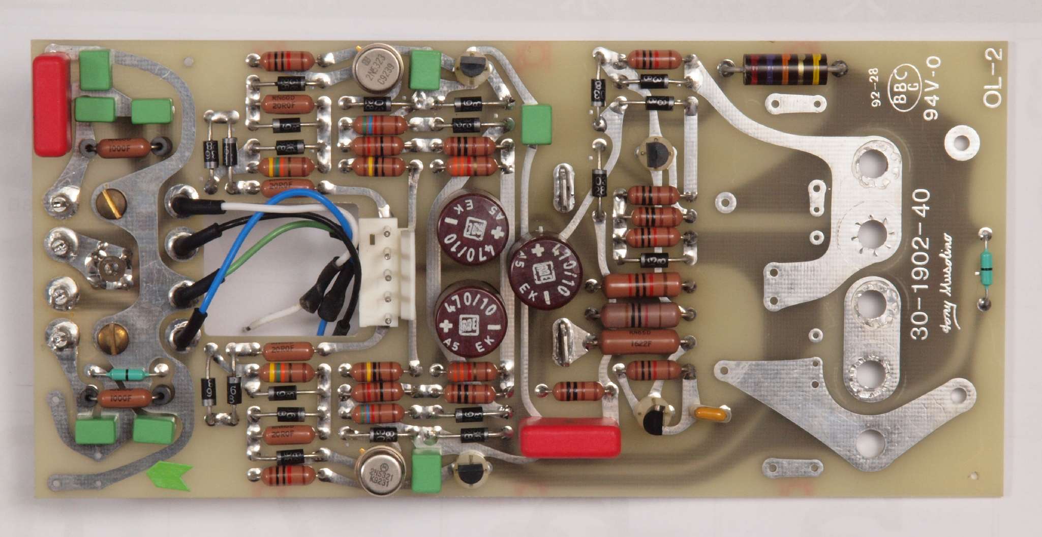 C112. 修理中 右側SP接続端子裏プロテクト基板。ヒビの入った3個の電解コンデンサー。