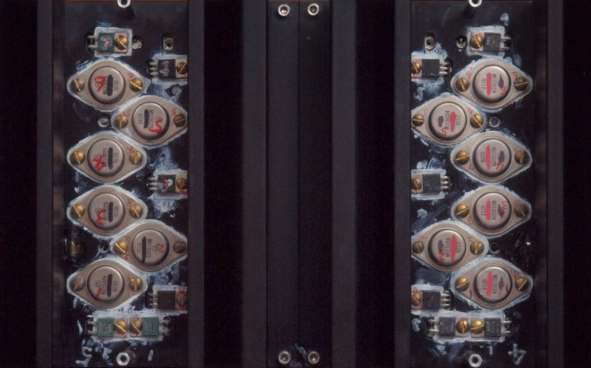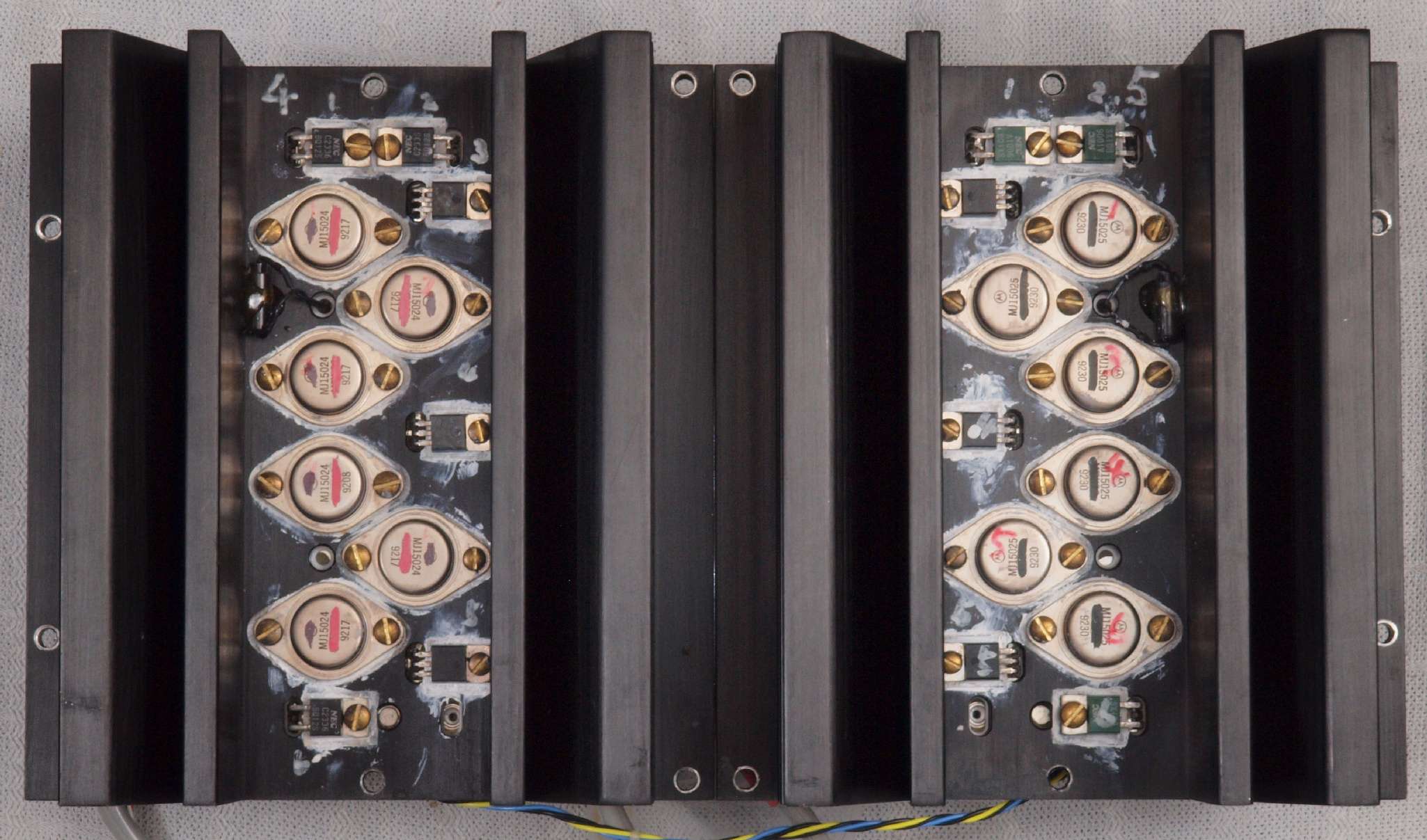C34. 修理後 右側終段ブロック裏。 基板に力が加わらない様、修理中は放熱器を上下固定して置く。