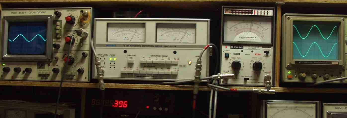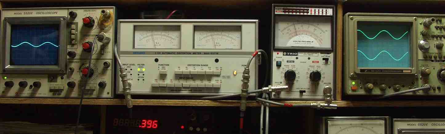 | 12.出力=0.3V 歪み率=0.03% 400HZ 右下オシロ=入力波形=AUX入力 左=黒針=下、右=赤針=上 |
