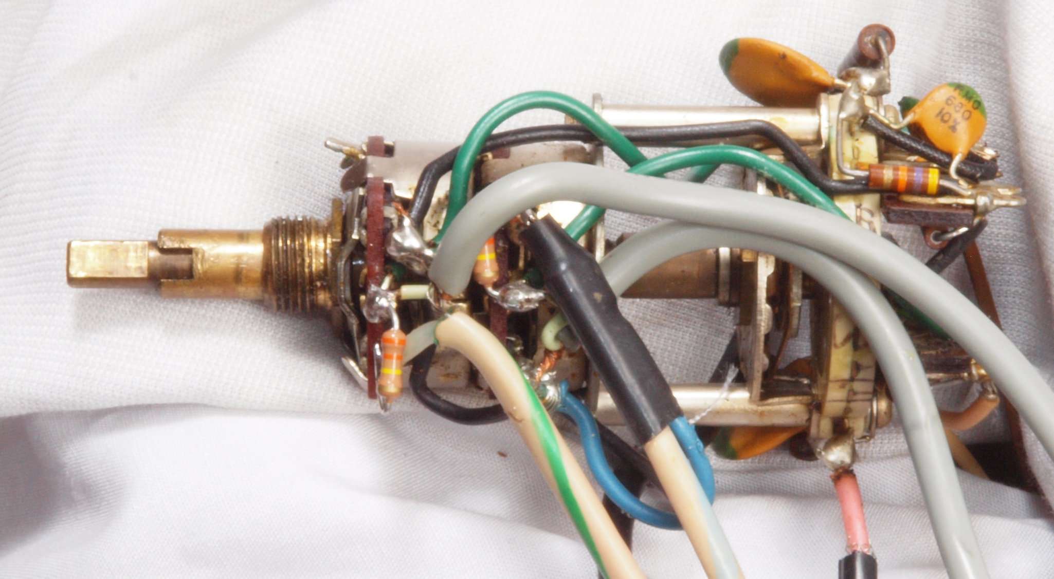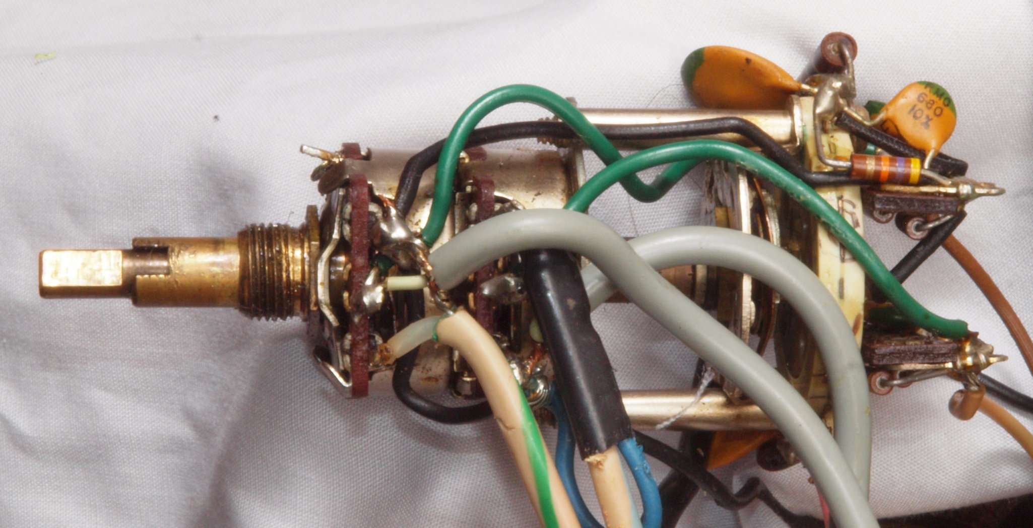 | C71. 修理前 メインVR・電源SW。 メインVRの接点復活剤の塗布跡!ラウドネスのシールド線のアースが未接続! | ||||||||||||||||||||||||||||||||||||||||||||||||||||||||||