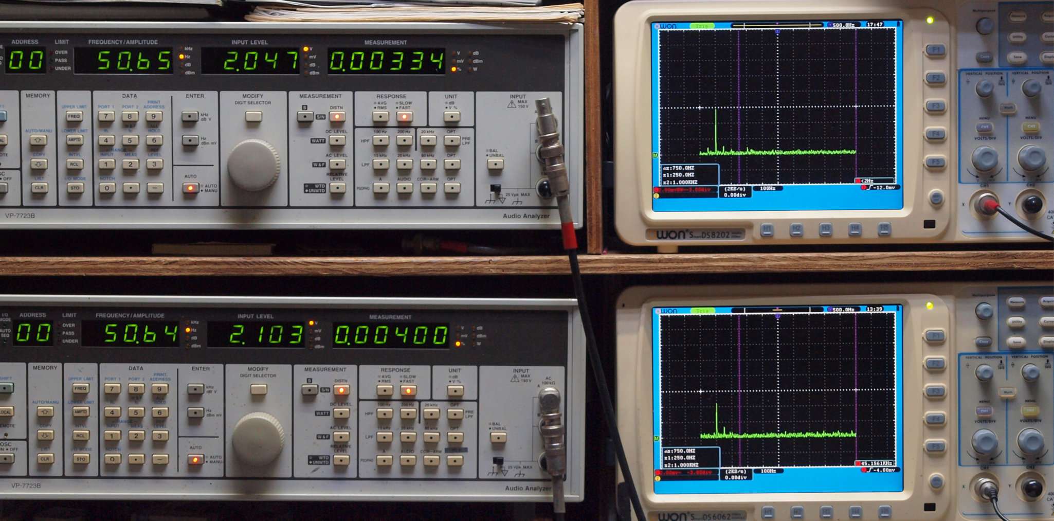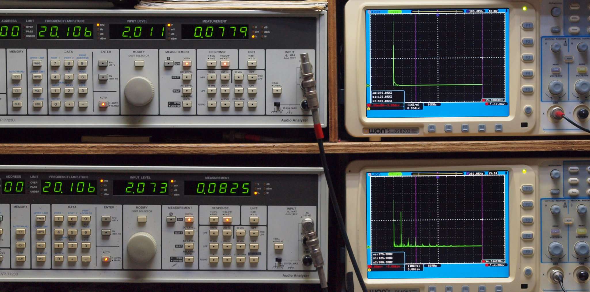 | E. 調整・測定。 画像をクリックすると、大きく(横幅2050ドット)表示されます。 E0. 出力・歪み率測定・調整。 「見方」。 上段中 右側出力を「Audio Analyzer Panasonic VP−7723B」により測定。 表示LED、 左端=メモリーNo、 中左=周波数測定、 中右=出力電圧測定、 右端=歪み率測定。 上段右端 VP−7723Bの基本波除去出力を「owon SDS8202(200MHZ)」で「FFT分析」表示。 下段中 左側出力を「Audio Analyzer Panasonic VP−7723B」により測定。 表示LED、 左端=メモリーNo、 中左=周波数測定、 中右=出力電圧測定、 右端=歪み率測定。 下段右端 VP−7723Bの基本波除去出力を「owon SDS6062(200MHZ)」で「FFT分析」表示。 下段左端 オーディオ発振器 VP−7201A より50Hz〜100kHzの信号を出し(歪み率=約0.003%)、ATT+分配器を通し、AMPに入力。 よって、ダイアル設定出力レベルより低くなります。測定機器の仕様や整備の様子はこちら、「VP−7723B」「VP−7201A」。 FFT画面の見方はこちら。 |