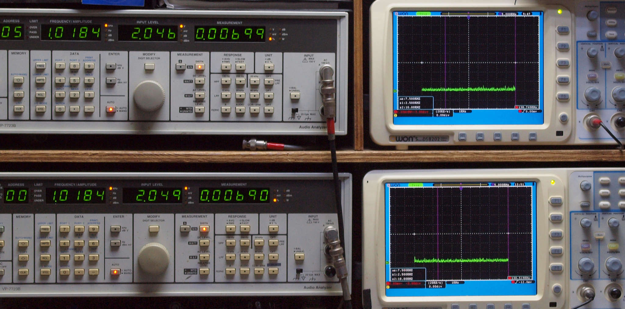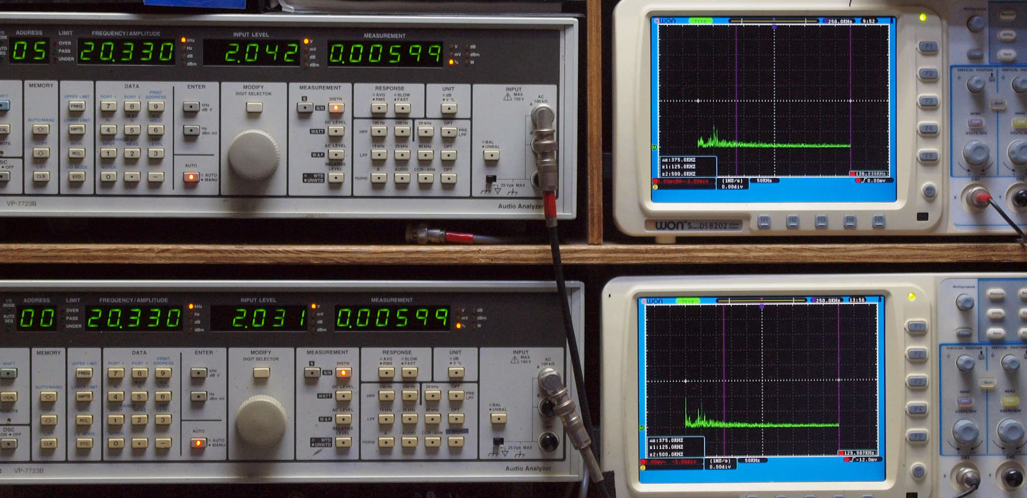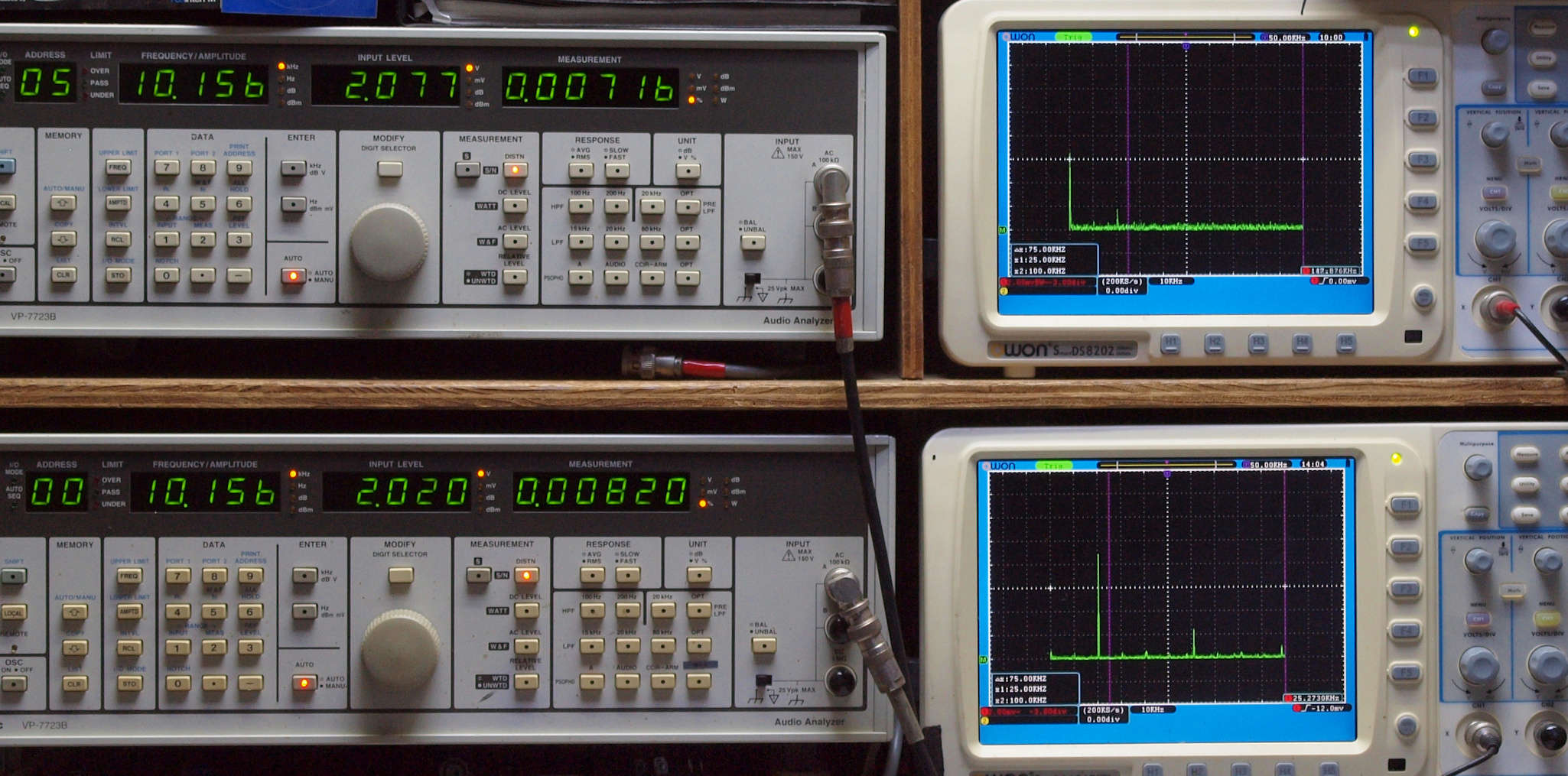 | E. 調整・測定。 画像をクリックすると、大きく(横幅2050ドット)表示されます。 E0. 出力・歪み率測定・調整、「電源電圧は50HZ 100V」。 「見方」。 上段中 右側出力を「Audio Analyzer Panasonic VP−7723B」により測定。 表示LED、 左端=メモリーNo、 中左=周波数測定、 中右=出力電圧測定、 右端=歪み率測定。 上段右端 VP−7723Bの基本波除去出力を「owon SDS8202(200MHZ)」で「FFT分析」表示。 下段中 左側出力を「Audio Analyzer Panasonic VP−7723B」により測定。 表示LED、 左端=メモリーNo、 中左=周波数測定、 中右=出力電圧測定、 右端=歪み率測定。 下段右端 VP−7723Bの基本波除去出力を「owon SDS6062(200MHZ)」で「FFT分析」表示。 下段左端 オーディオ発振器 VP−7201A より50Hz〜100kHzの信号を出し(歪み率=約0.003%)、ATT+分配器を通し、AMPに入力。 よって、ダイアル設定出力レベルより低くなります。測定機器の仕様や整備の様子はこちら、「VP−7723B」「VP−7201A」。 FFT画面の見方はこちら。 |