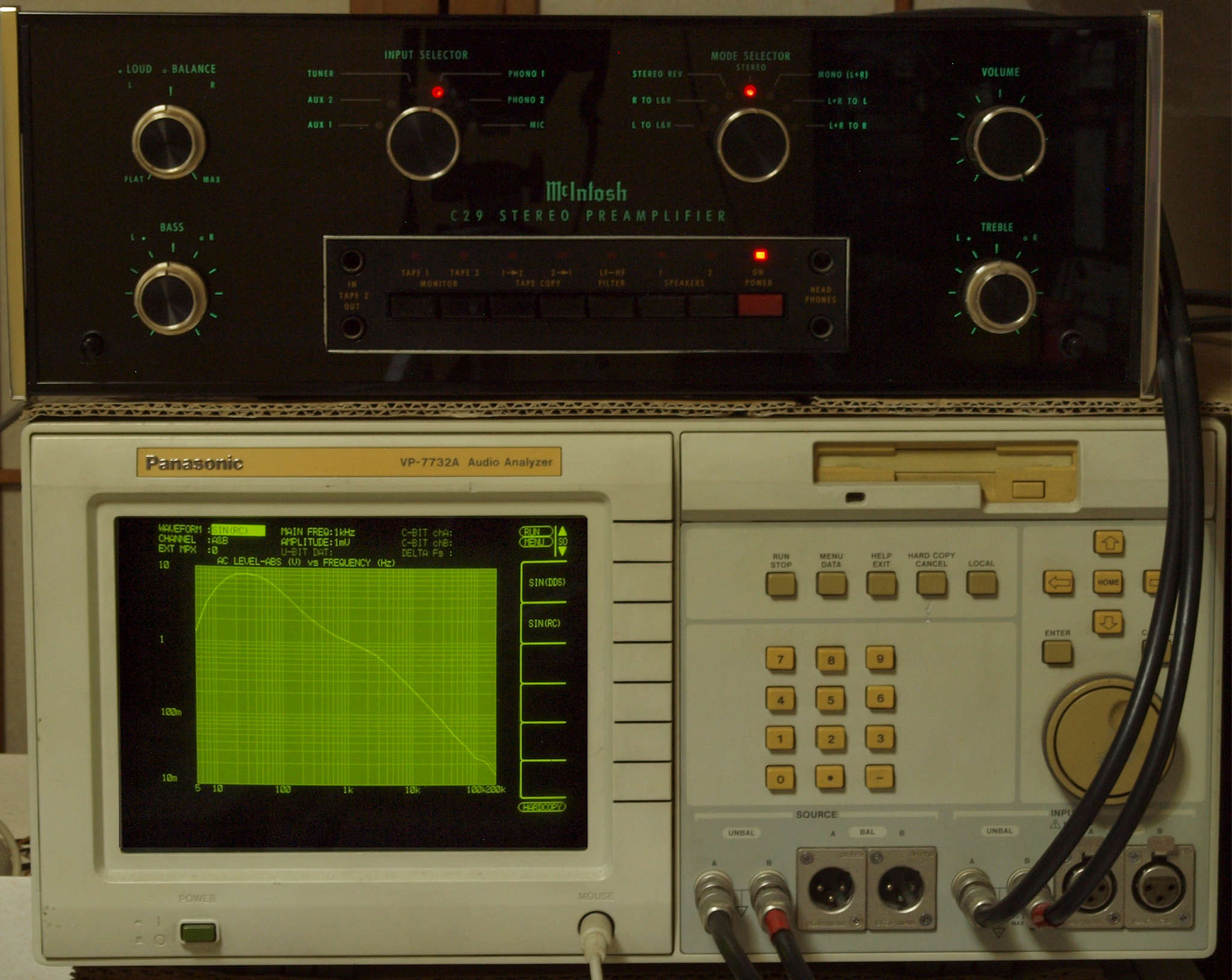 | F. 上位測定器による 調整・測定。 画像をクリックすると、大きく(横幅2050ドット)表示されます。 F0. 下のオーディオアナライザーVP−7732Aで自動測定。 「電源電圧は50HZ 100V」 |