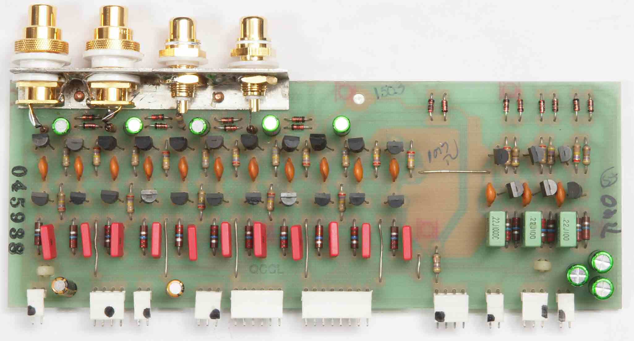 C32. 修理後 HighLevelInput TapeOutSW−右基板。 電解コンデンサー10個交換。フイルムコンデンサー11個追加。