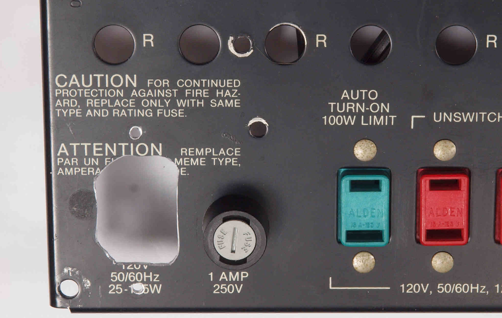 A52. 点検中 電源コード取り付け部。 3Pインレットに交換可能。木ケースのストッパが使用がやりずらいかも?