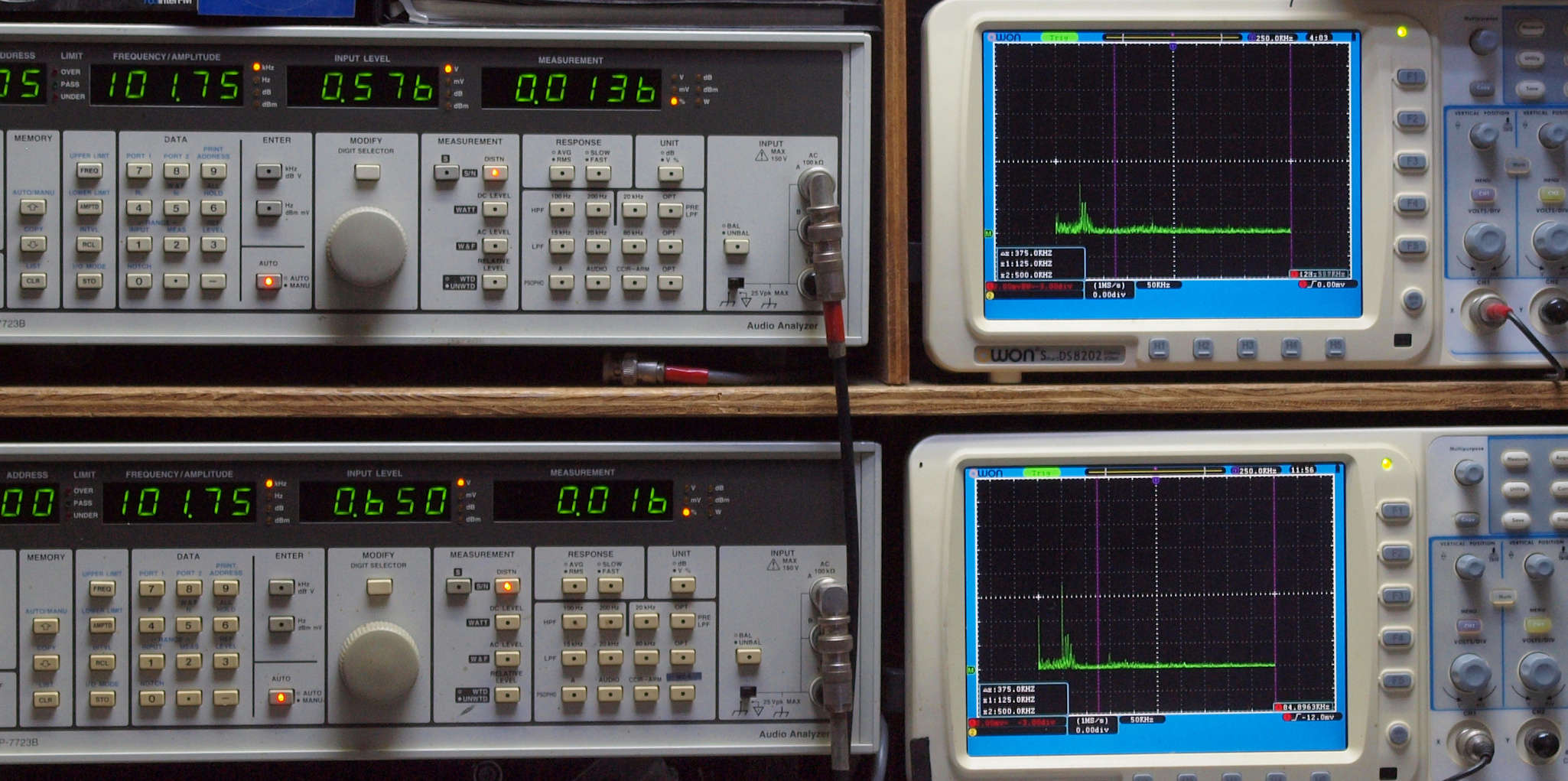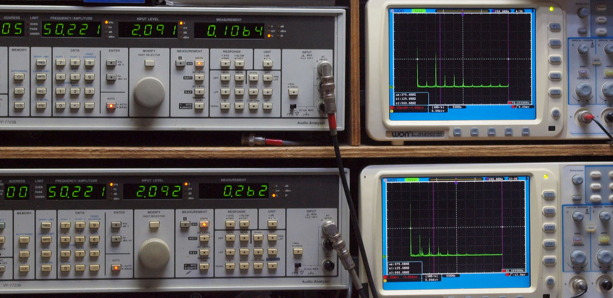 | E. 調整・測定。 画像をクリックすると、大きく(横幅2050ドット)表示されます。 E0. 出力・歪み率測定・調整、「電源電圧は50HZ 100V」。 「見方」。 上段中 右側出力を「Audio Analyzer Panasonic VP−7723B」により測定。 表示LED、 左端=メモリーNo、 中左=周波数測定、 中右=出力電圧測定、 右端=歪み率測定。 上段右端 VP−7723Bの基本波除去出力を「owon SDS8202(200MHZ)」で「FFT分析」表示。 下段中 左側出力を「Audio Analyzer Panasonic VP−7723B」により測定。 表示LED、 左端=メモリーNo、 中左=周波数測定、 中右=出力電圧測定、 右端=歪み率測定。 下段右端 VP−7723Bの基本波除去出力を「owon SDS6062(200MHZ)」で「FFT分析」表示。 下段左端 オーディオ発振器 VP−7201A より50Hz〜100kHzの信号を出し(歪み率=約0.003%)、ATT+分配器を通し、AMPに入力。 よって、ダイアル設定出力レベルより低くなります。測定機器の仕様や整備の様子はこちら、「VP−7723B」「VP−7201A」。 FFT画面の見方はこちら。 |