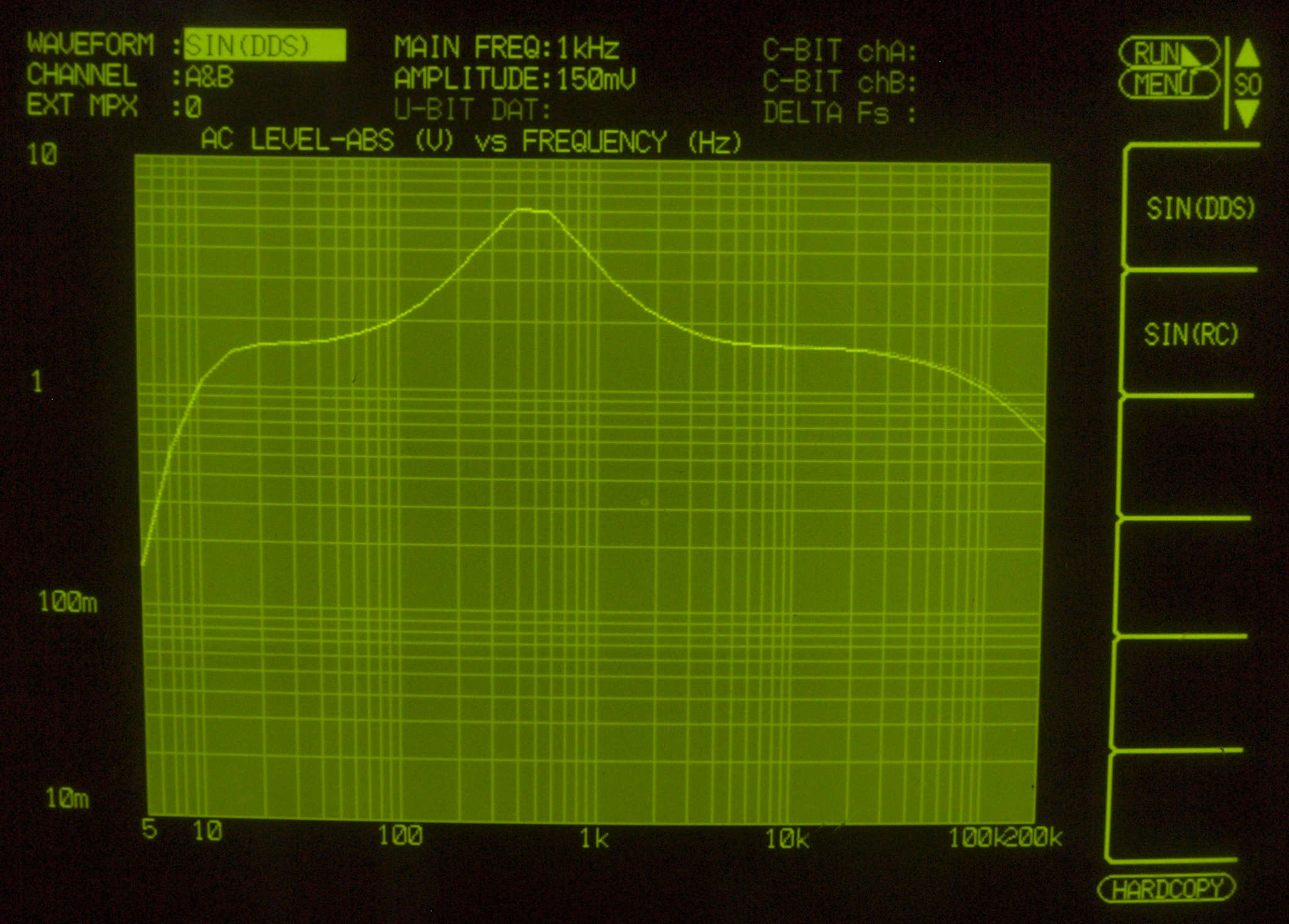 | F16. 入出力特性測定(CD入力) BASS(150Hz) & TREBLE(1500kHz) 最小 CD入力端子へ150mV一定入力 VRはmax 左出力=薄(細い)色 右出力=濃い(太い)色 |
