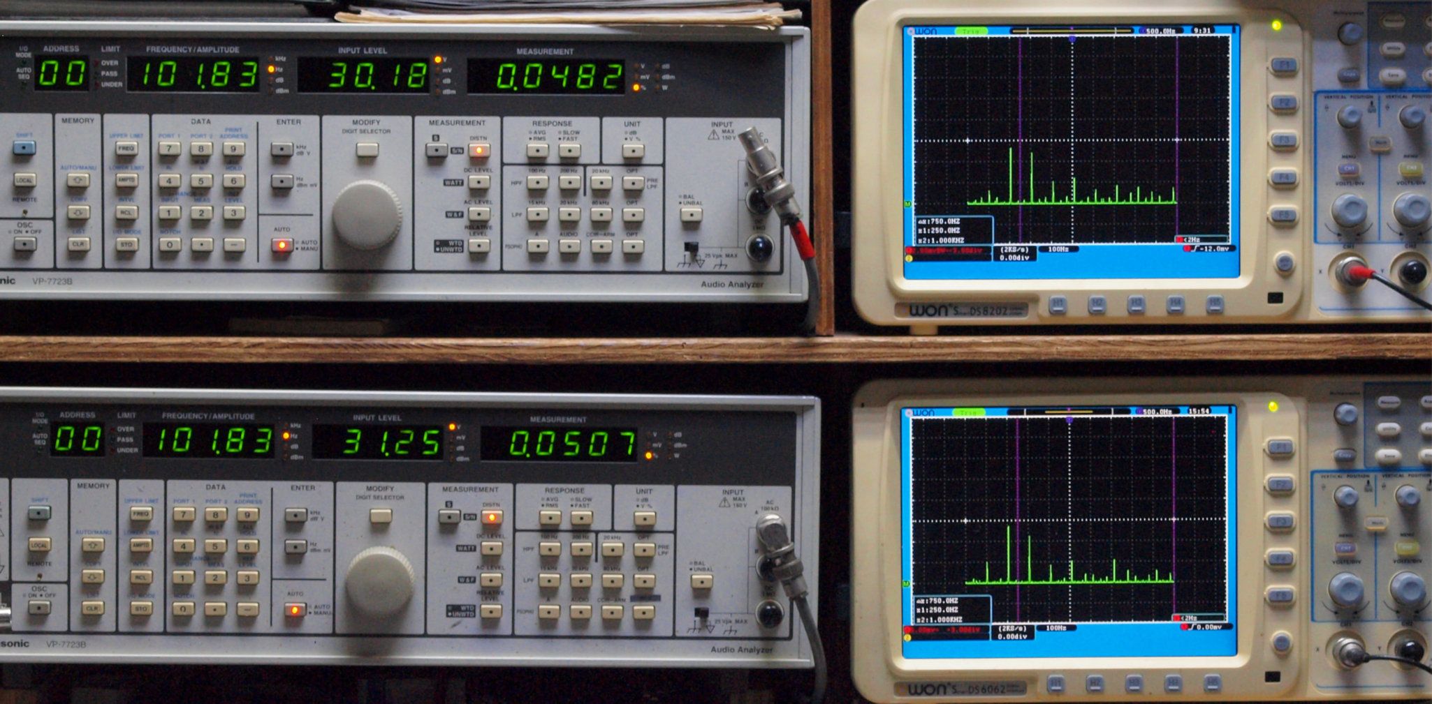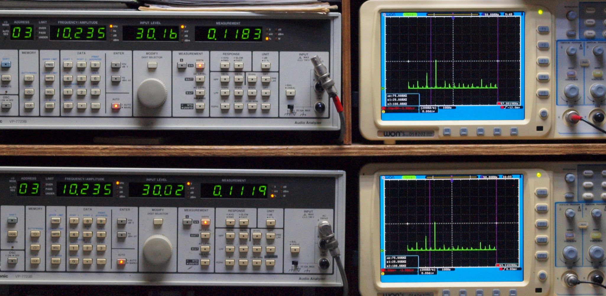 | E. 測定・調整。 画像をクリックすると、大きく(横幅2050ドット)表示されます。 E0. 出力・歪み率測定・調整 「見方」。 上段中 右側SP出力を「Audio Analyzer Panasonic VP−7723B」により測定。 表示LED、 左端=メモリーNo、 中左=周波数測定、 中右=出力電圧測定、 右端=歪み率測定。 上段右端 VP−7723Bの基本波除去出力を「owon SDS8202(200MHZ)」で「FFT分析」表示。 下段中 左側SP出力を「Audio Analyzer Panasonic VP−7723B」により測定。 表示LED、 左端=メモリーNo、 中左=周波数測定、 中右=出力電圧測定、 右端=歪み率測定。 下段右端 VP−7723Bの基本波除去出力を「owon SDS6062(200MHZ)」で「FFT分析」表示。 下段左端 オーディオ発振器 VP−7201A より50Hz〜100kHzの信号を出し(歪み率=約0.003%)、ATT+分配器を通し、AMPに入力。 よって、ダイアル設定出力レベルより低くなります。測定機器の仕様や整備の様子はこちら、「VP−7723B」「VP−7201A」。 FFT画面の見方はこちら。 |