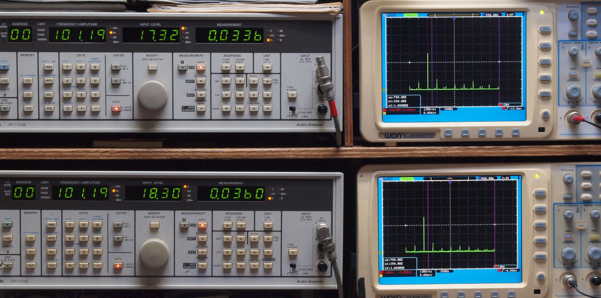 | E. 測定・調整。 画像をクリックすると、大きく(横幅2050ドット)表示されます。 E0. 出力・歪み率測定・調整 本器は117V仕様なので100Vでの出力は36.5W。 「見方」。 上段中 右側SP出力を「Audio Analyzer Panasonic VP−7723B」により測定。 表示LED、 左端=メモリーNo、 中左=周波数測定、 中右=出力電圧測定、 右端=歪み率測定。 上段右端 VP−7723Bの基本波除去出力を「owon SDS8202(200MHZ)」で「FFT分析」表示。 下段中 左側SP出力を「Audio Analyzer Panasonic VP−7723B」により測定。 表示LED、 左端=メモリーNo、 中左=周波数測定、 中右=出力電圧測定、 右端=歪み率測定。 下段右端 VP−7723Bの基本波除去出力を「owon SDS6062(200MHZ)」で「FFT分析」表示。 下段左端 オーディオ発振器 VP−7201A より50Hz〜100kHzの信号を出し(歪み率=約0.003%)、ATT+分配器を通し、AMPに入力。 よって、ダイアル設定出力レベルより低くなります。測定機器の仕様や整備の様子はこちら、「VP−7723B」「VP−7201A」。 FFT画面の見方はこちら。 |