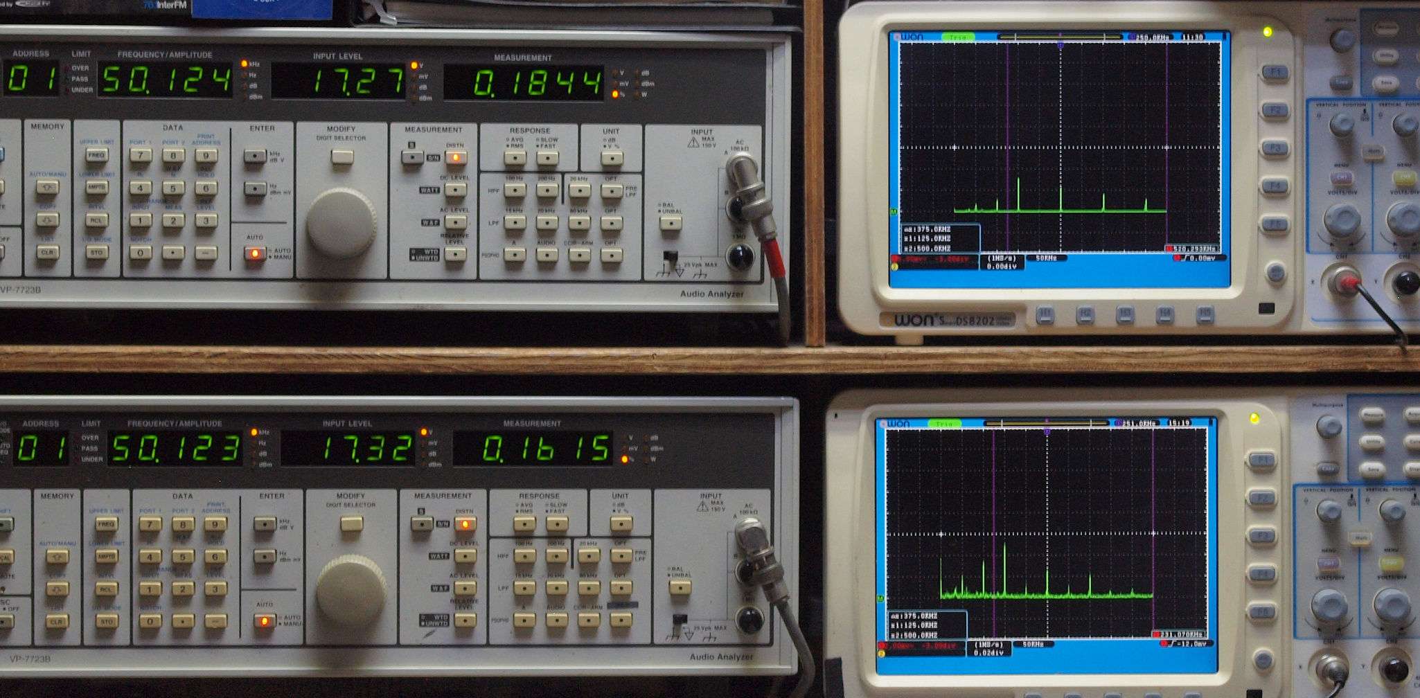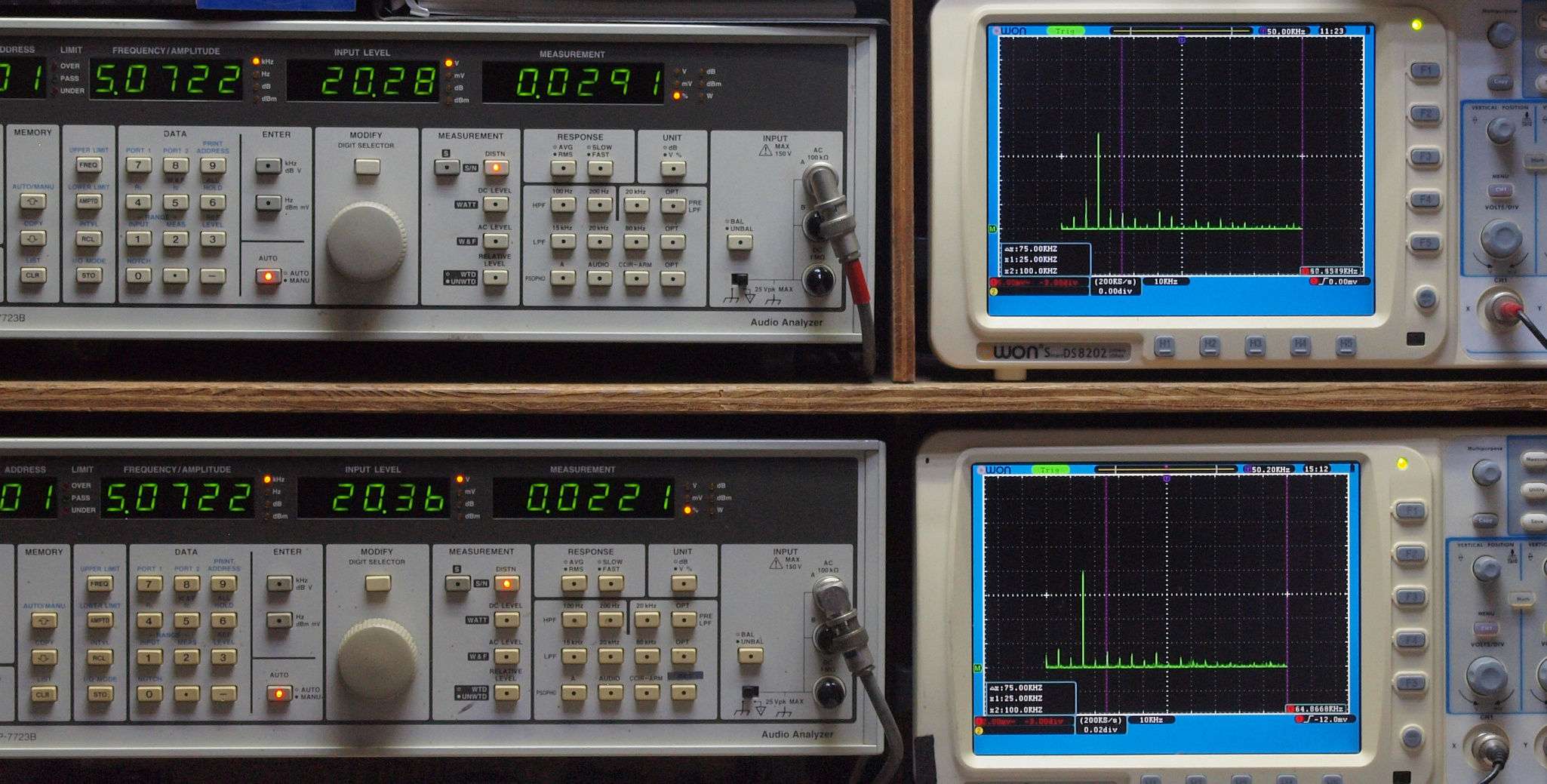 | E. 測定・調整。 画像をクリックすると、大きく(横幅2050ドット)表示されます。 E0. 出力・歪み率測定・調整。 電源はAC100Vで測定。 「見方」。 上段中 右側SP出力を「Audio Analyzer Panasonic VP−7723B」により測定。 表示LED、 左端=メモリーNo、 中左=周波数測定、 中右=出力電圧測定、 右端=歪み率測定。 上段右端 VP−7723Bの基本波除去出力を「owon SDS8202(200MHZ)」で「FFT分析」表示。 下段中 左側SP出力を「Audio Analyzer Panasonic VP−7723B」により測定。 表示LED、 左端=メモリーNo、 中左=周波数測定、 中右=出力電圧測定、 右端=歪み率測定。 下段右端 VP−7723Bの基本波除去出力を「owon SDS6062(200MHZ)」で「FFT分析」表示。 下段左端 オーディオ発振器 VP−7201A より50Hz〜100kHzの信号を出し(歪み率=約0.003%)、ATT+分配器を通し、AMPに入力。 よって、ダイアル設定出力レベルより低くなります。測定機器の仕様や整備の様子はこちら、「VP−7723B」「VP−7201A」。 FFT画面の見方はこちら。 |