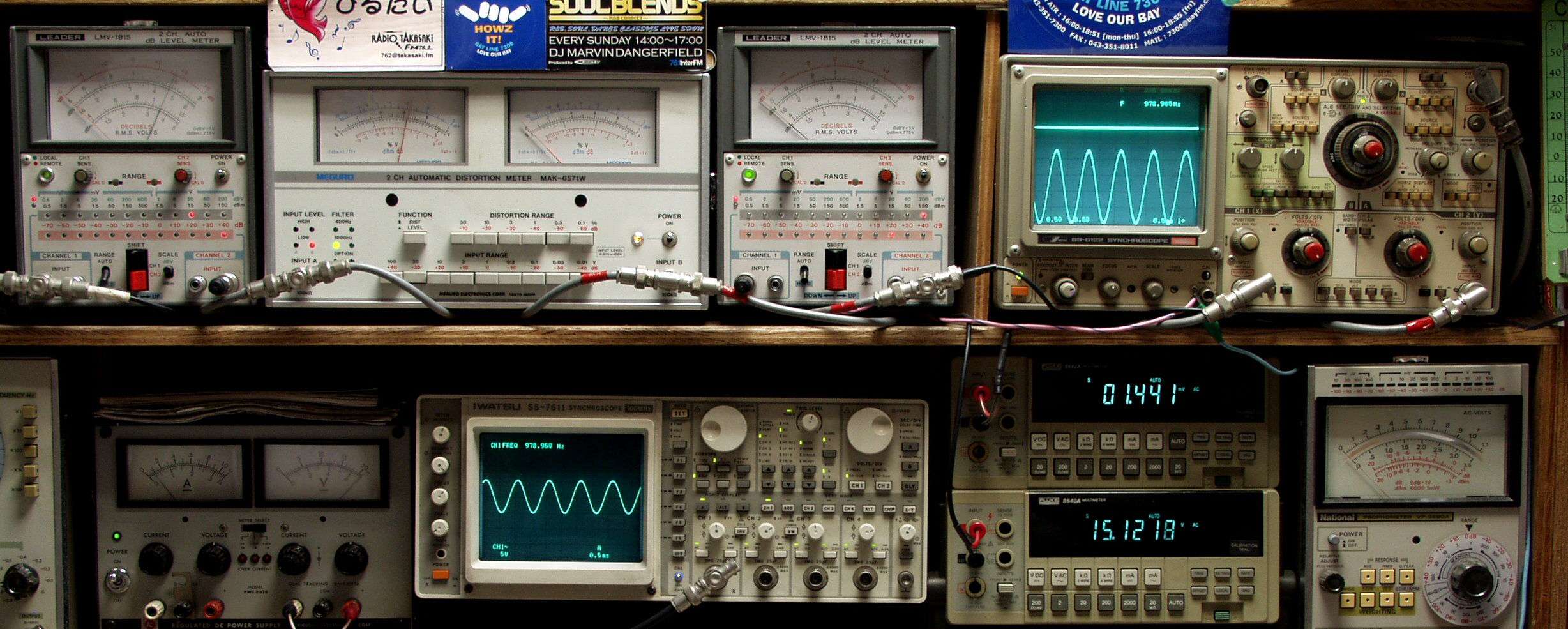 下段左端 オーディオ発振器より400HZ・1KHZの信号を出し(歪み率=約0.003%)これをAMPに入力し、出力を測定.