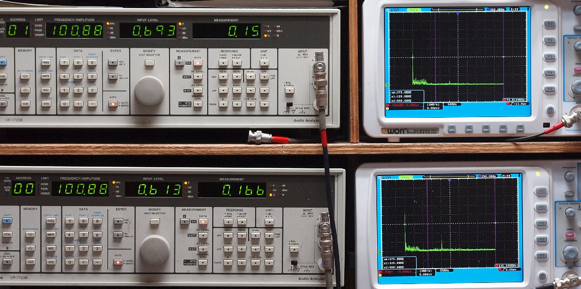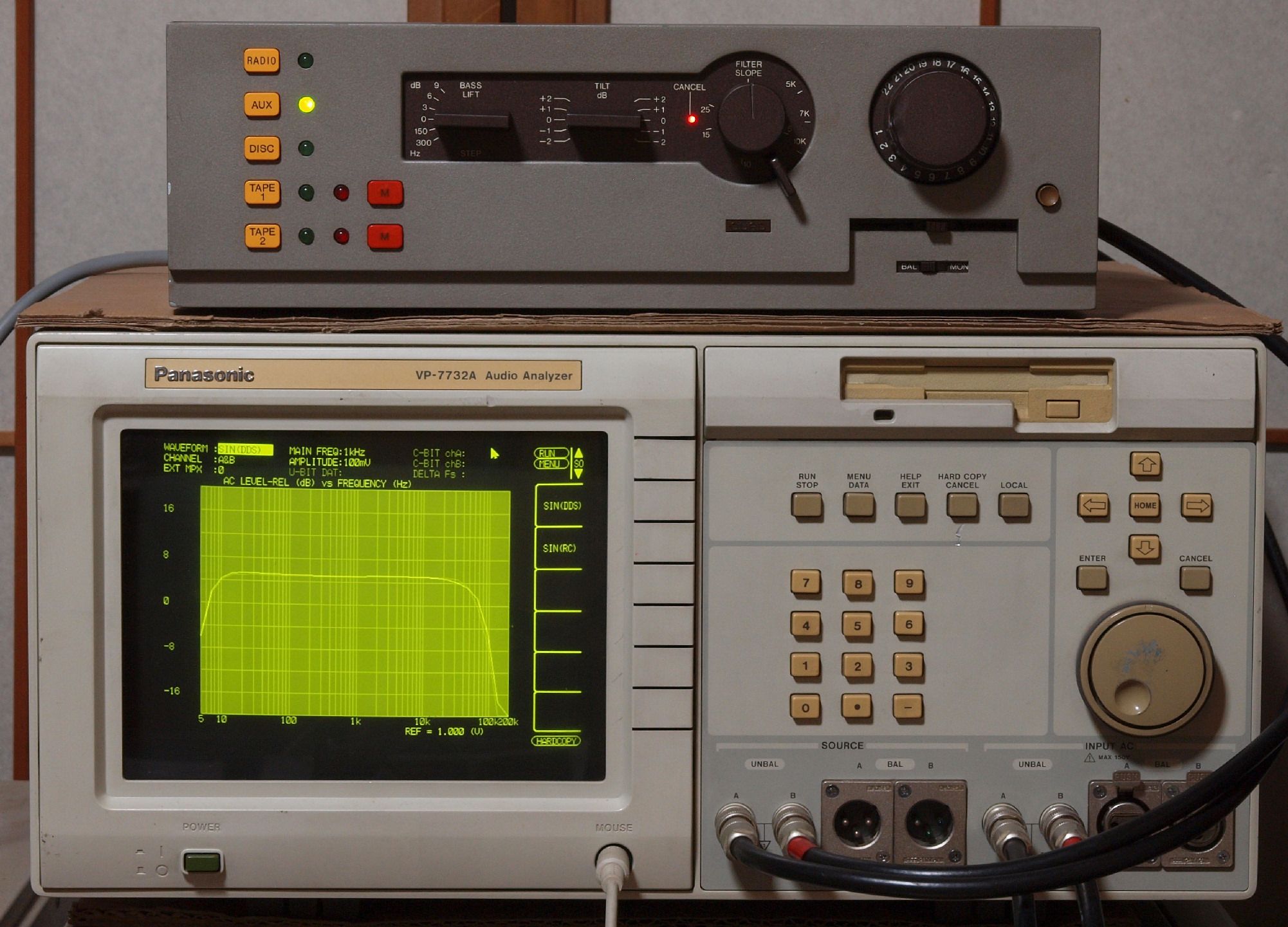 | F. 上位測定機器での調整・測定 F0. 下のオーディオアナライザーVP−7732Aで自動測定。 |