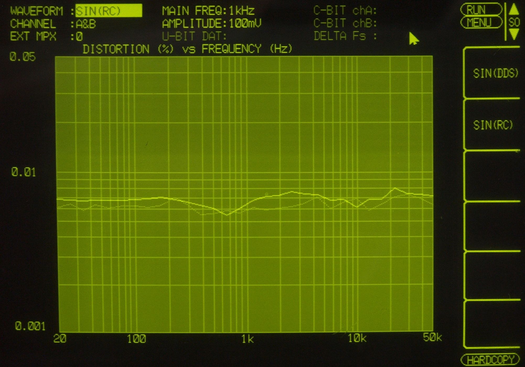| E5. Radio入力、5kHz、R側出力電圧5V、 0.050%歪み。 L側出力電圧5V、 0.055%歪み。 「FFT分析」のオシロのカーソル周波数、左=25kHz、右=100kHz。 |