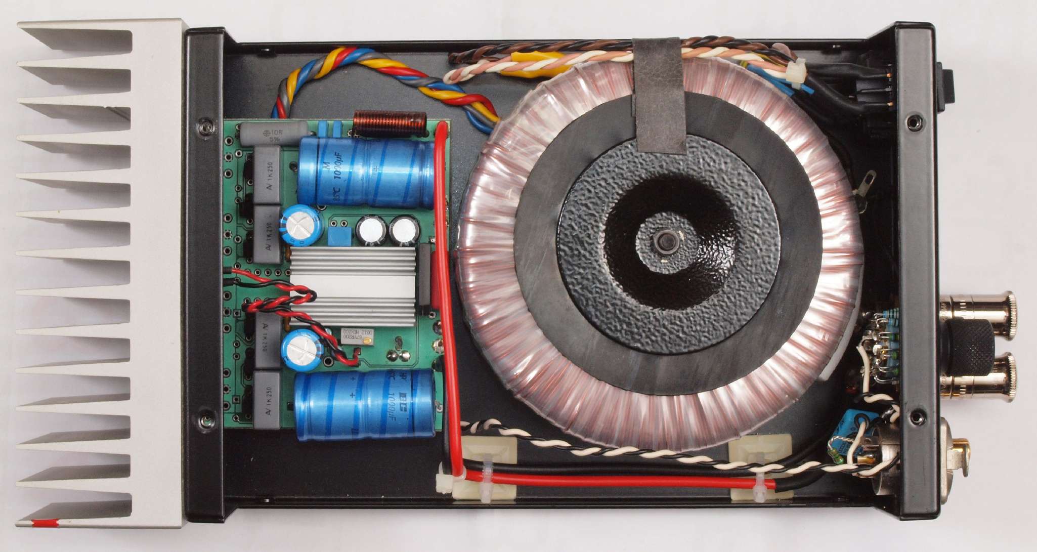 | A17. 点検中 上蓋を取り、上から見る。 終段FET(電解トランジスター)は日立2SK1058/2SJ162。 右側のPhilips製電解コンデンサーの頭が膨れている。 |