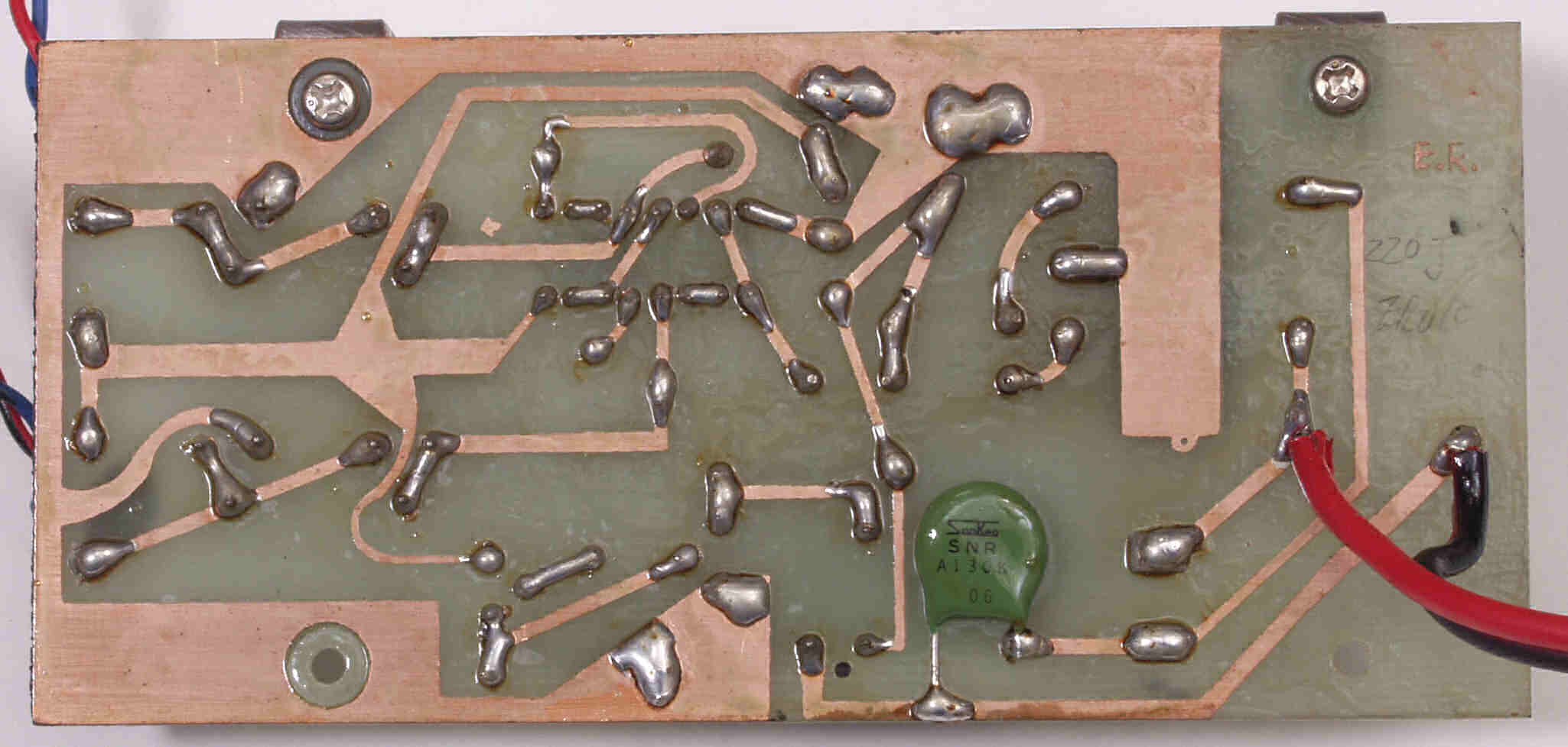 | C64. 修理(半田補正)後 L「+」側−終段TR(トランジスター)基板裏、 半固定VR1個交換 | ||||||||||||||||||||||||||