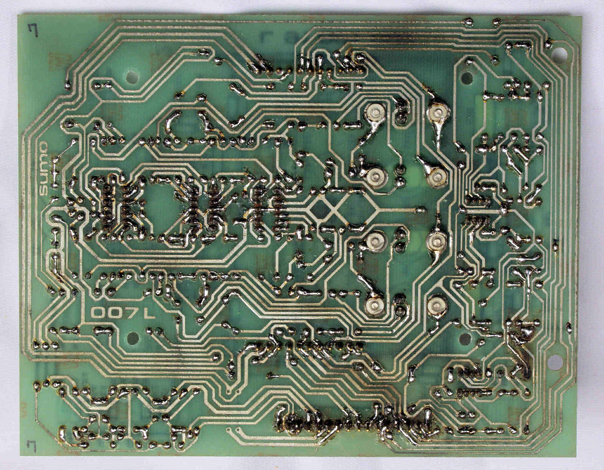 C911. 修理中 L側−終段TR(トランジスター)基板裏「−」、大きな事故で液漏れして腐食した銅箔。