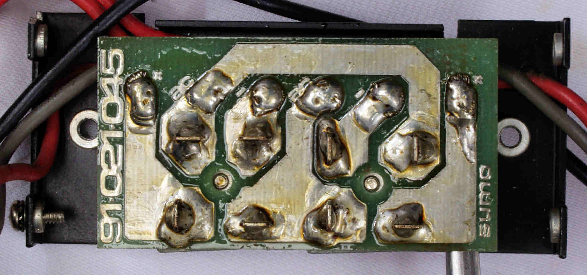 C971. 修理(半田補正)中、 L側−終段AMPユニット整流器基板裏、 端子にも半田を盛る、手前右2個が半田補正後。