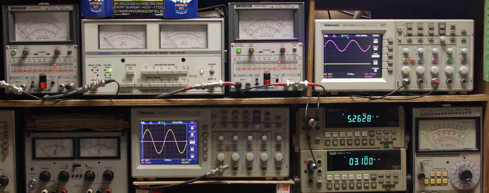 上段中左 歪み率計=出力の歪み率測定 左メータ=L出力、右メータ=R出力。