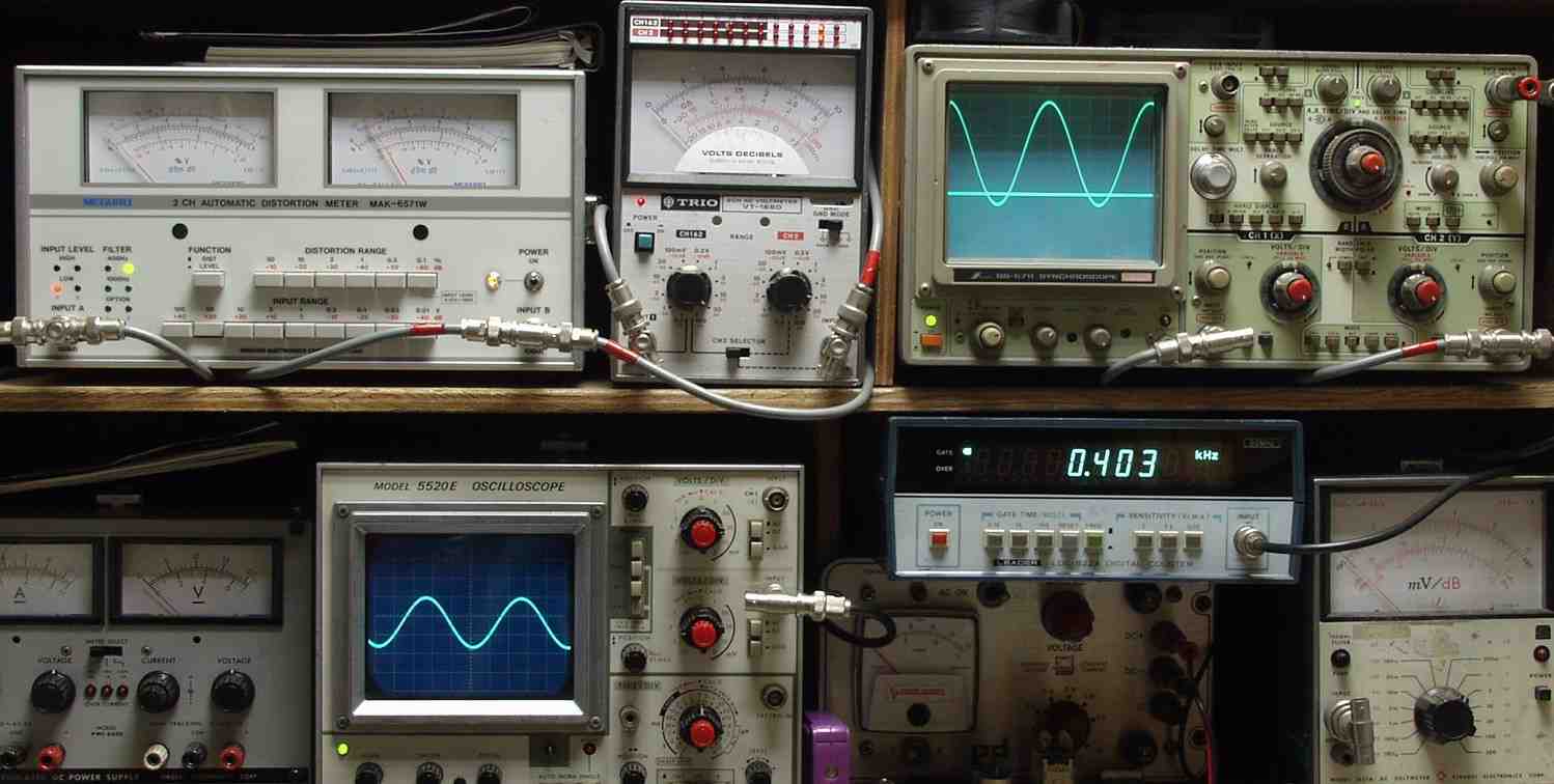 | E. 調整・測定 E1. 出力/歪み率測定・調整 <見方> 上左オーディオ発振器より400HZ・1KHZの信号を出す(歪み率=約0.003%) 下中=入力波形(オーディオ発振器のTTLレベル) 下右=周波数計 上左=SP出力の歪み率測定 左メータ=L出力、右メータ=R出力 上中=SP出力電圧測定器、赤針=R出力、黒針=L出力 上右=SP出力波形オシロ 上=R出力、下=L出力(出力電圧測定器の出力) |