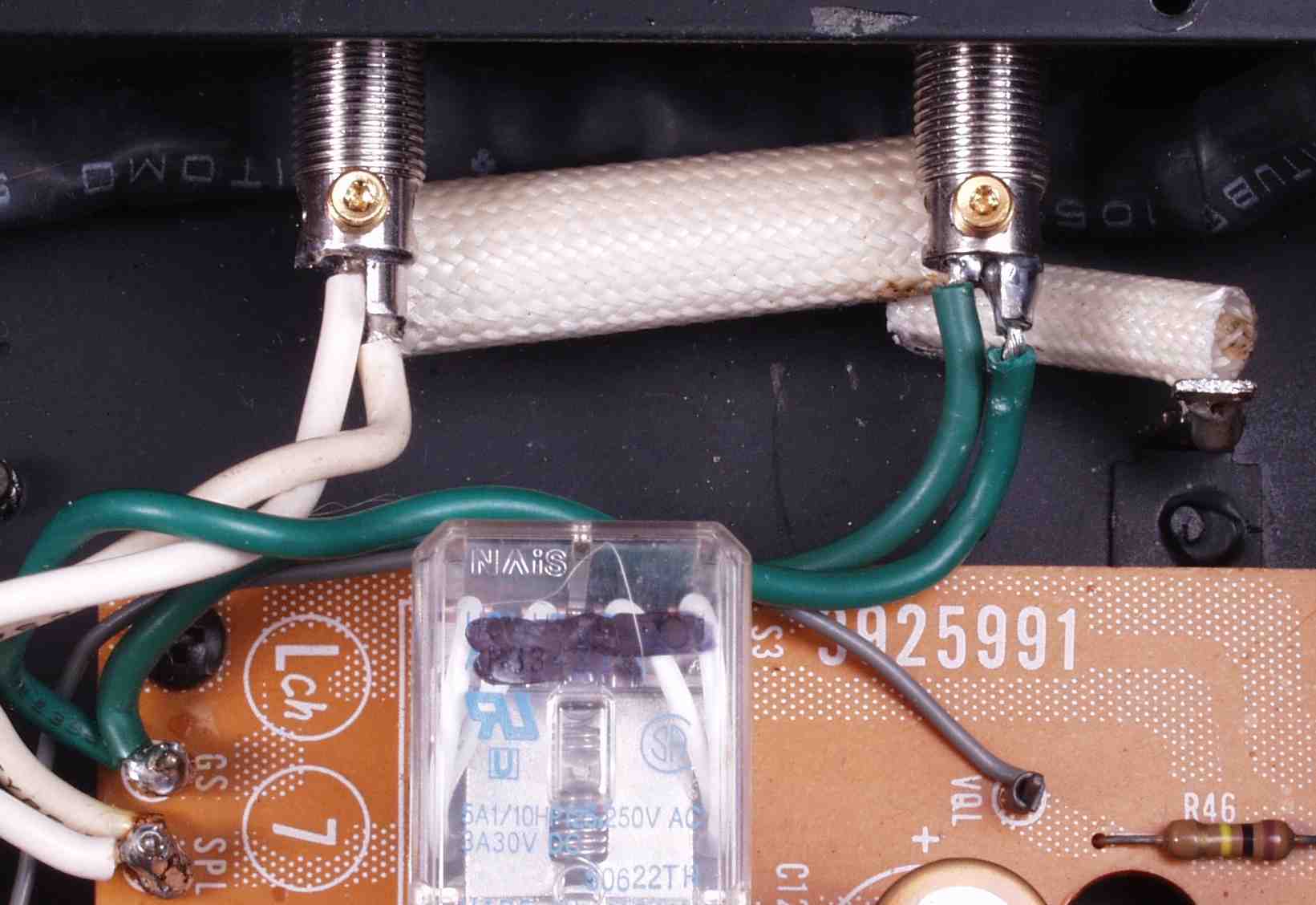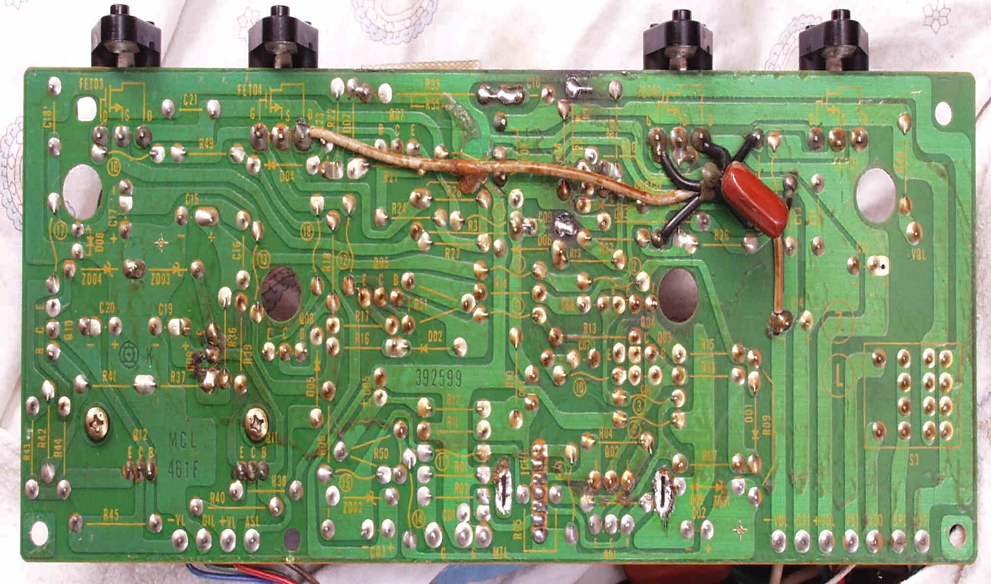 | A6. 修理前見積り点検中 L側AMP基板、発振の為焼けた抵抗の保護チューブ |