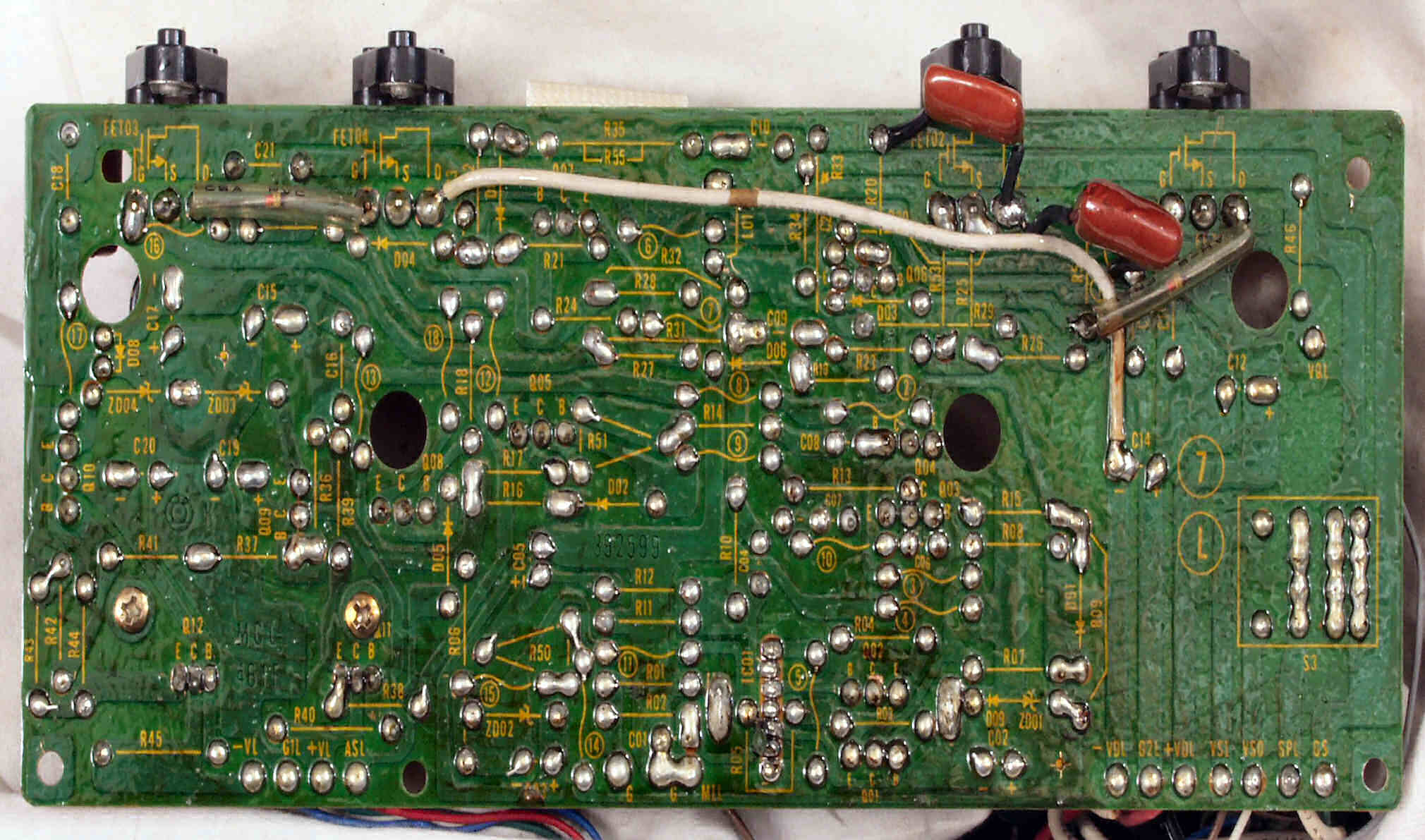 C5E. 修理(半田補正)中 修理後 入力RCA端子基盤裏、 フイルムコンデンサー2個交換、2個追加