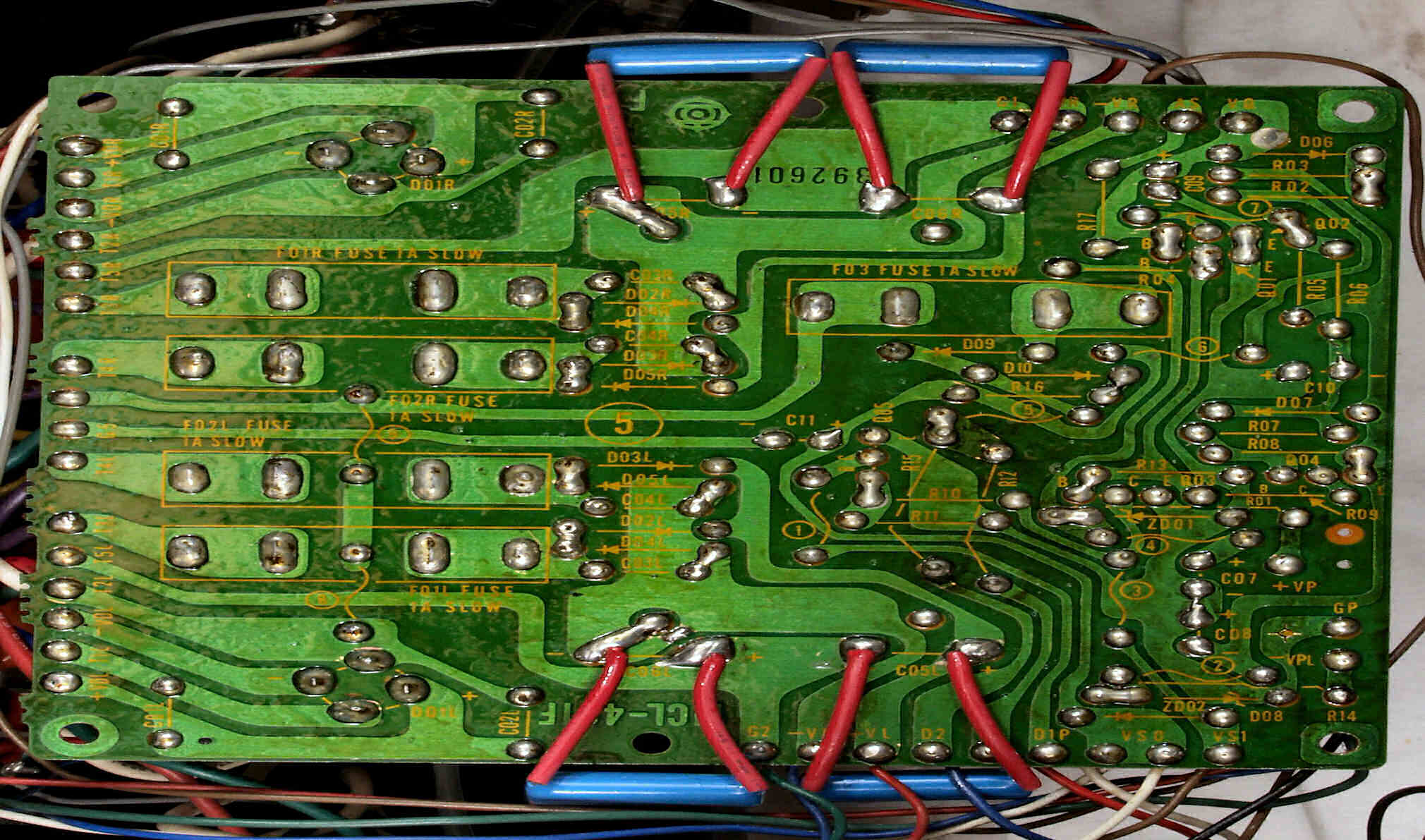 C4B. 修理後 電源基盤 電解コンデンサー9個、フューズ入り抵抗交換、フイルムコンデンサー4個追加