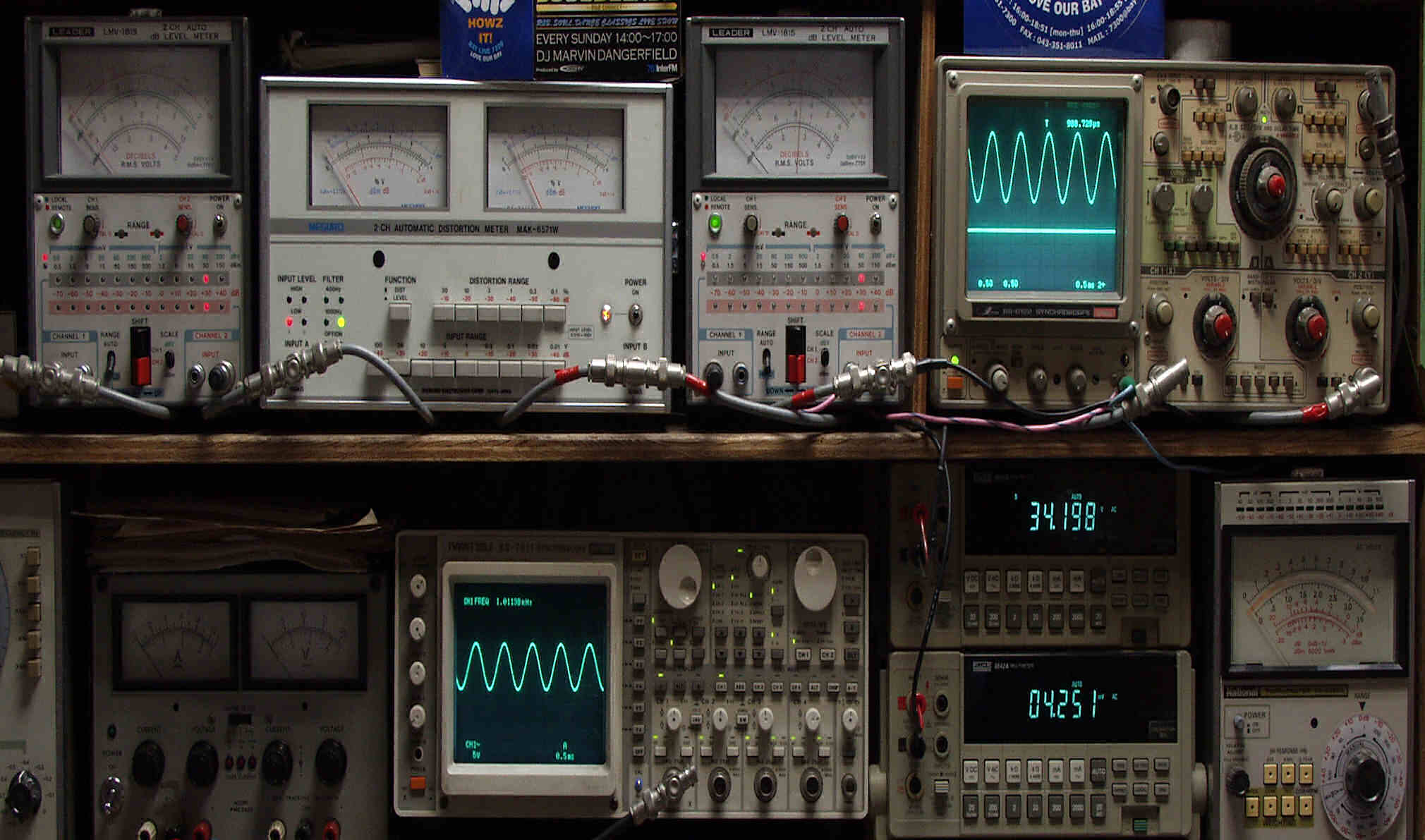 上段中左 歪み率計=出力の歪み率測定 左メータ=L出力、右メータ=R出力
