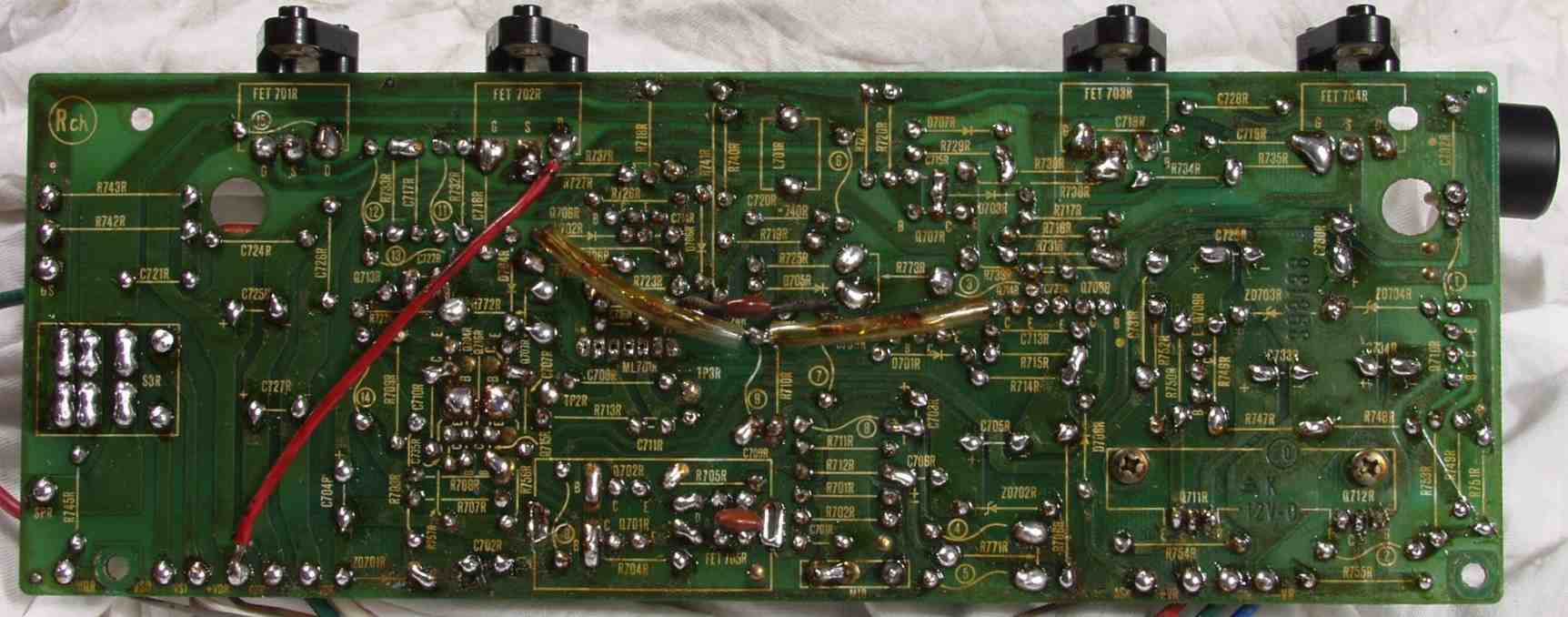 C1E1. 修理中 R側ドライブ基板裏 送り配線の被覆が剥けている。