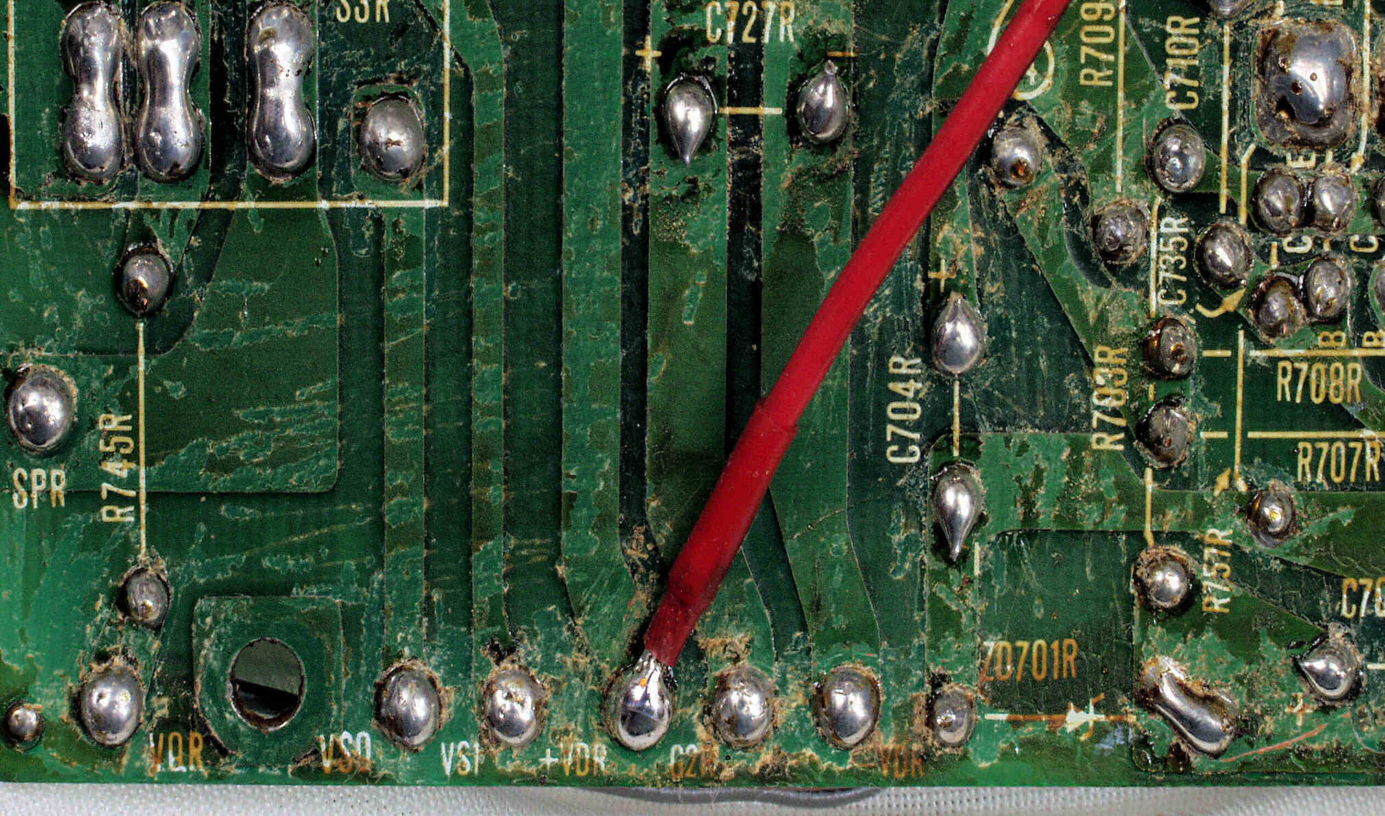 C7C. 修理後 R側ドライブ基板−電源基板へのラッピング線に半田を浸み込ませる