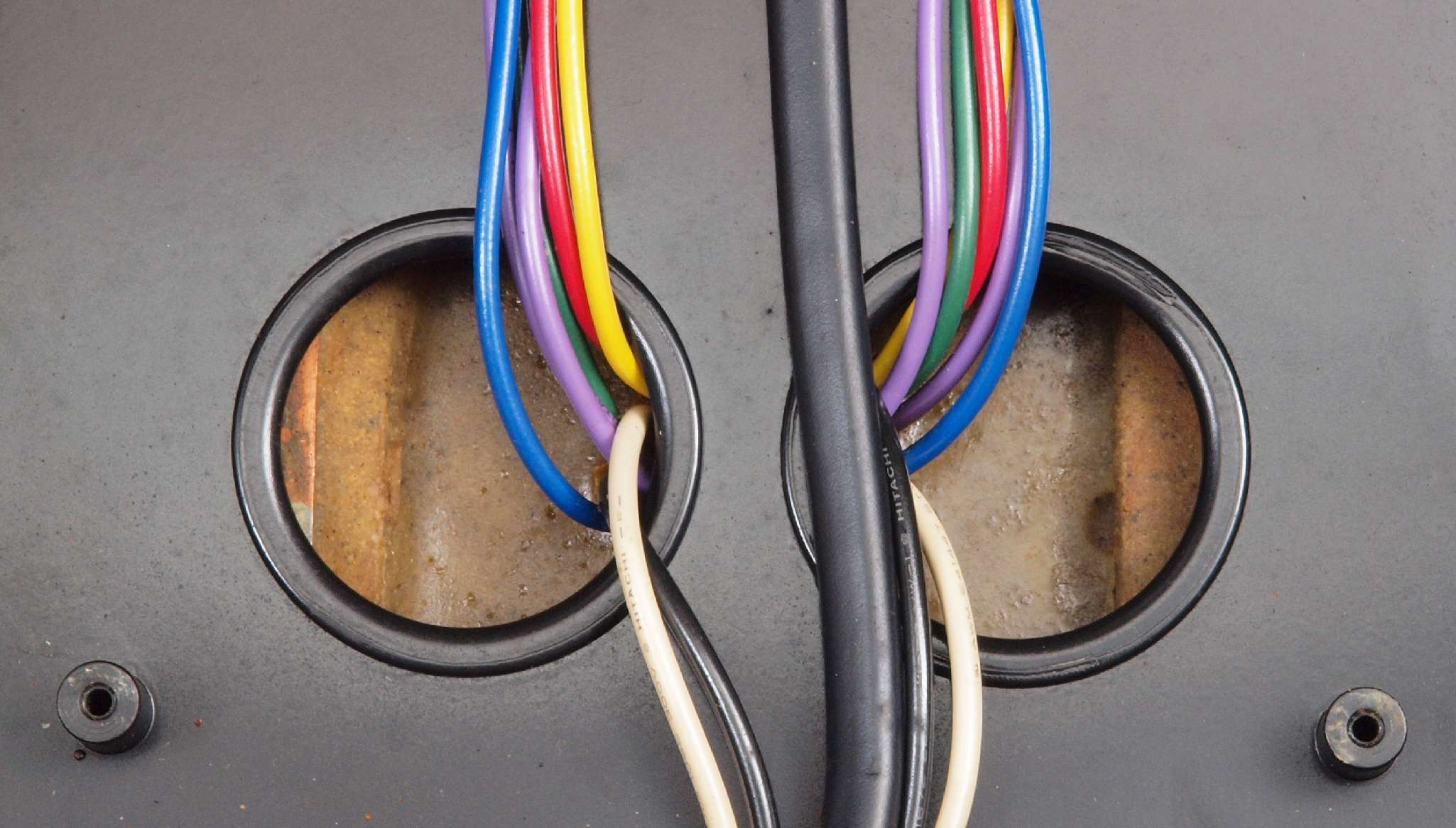 | C85. 修理前 L−SP端子裏配線。 電源コードが接着材で固定? |