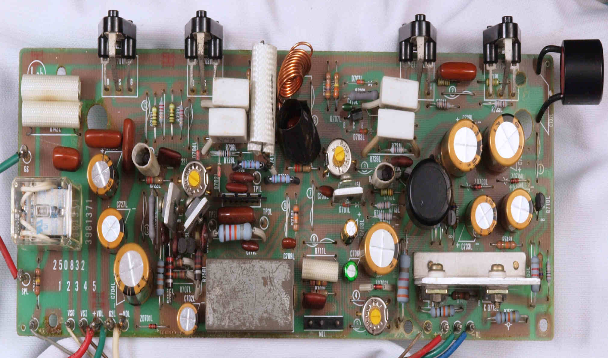 | C52. 修理中 電源基板、電解コンデンサー固定用の接着材が取り除かれていない、当時は溶媒にトルエンが使用されており、銅を腐食する。 |