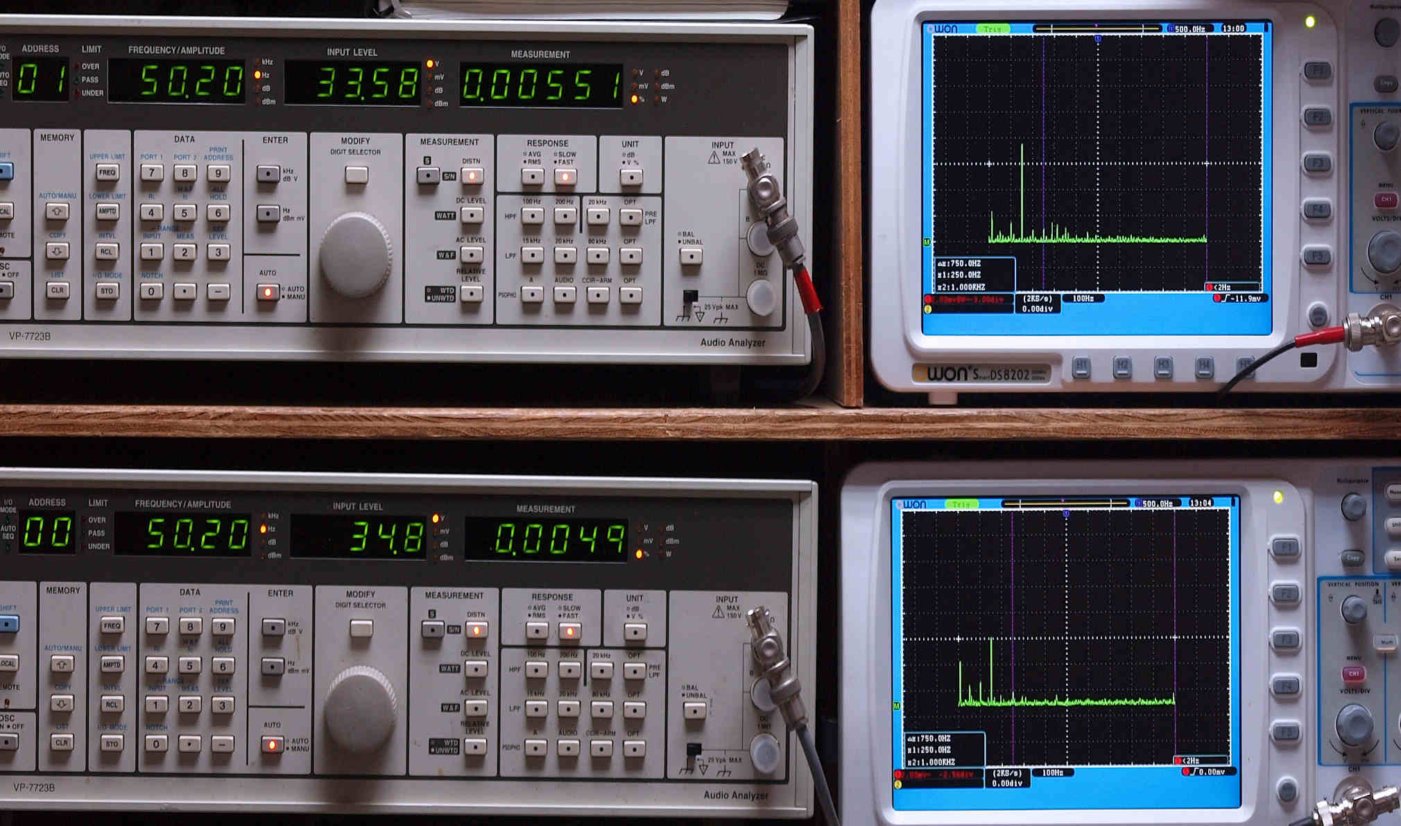 | E. 測定・調整 E1. 出力・歪み率測定・調整 「見方」。 上段中 右側SP出力を「Audio Analyzer Panasonic VP−7723B」により測定。 表示LED、 左端=メモリーNo、 中左=周波数測定、 中右=出力電圧測定、 右端=歪み率測定。 上段右端 VP−7723Bの基本波除去出力を「owon SDS8202(200MHZ)」で「FFT分析」表示。 下段中 左側SP出力を「Audio Analyzer Panasonic VP−7723B」により測定。 表示LED、 左端=メモリーNo、 中左=周波数測定、 中右=出力電圧測定、 右端=歪み率測定。 下段右端 VP−7723Bの基本波除去出力を「owon SDS6062(200MHZ)」で「FFT分析」表示。 下段左端 オーディオ発振器 VP−7201A より50Hz〜100kHzの信号を出し(歪み率=約0.003%)、ATT+分配器を通し、AMPに入力。 よって、ダイアル設定出力レベルより低くなります。測定機器の仕様や整備の様子はこちら、「VP−7723B」「VP−7201A」。 FFT画面の見方はこちら。 |