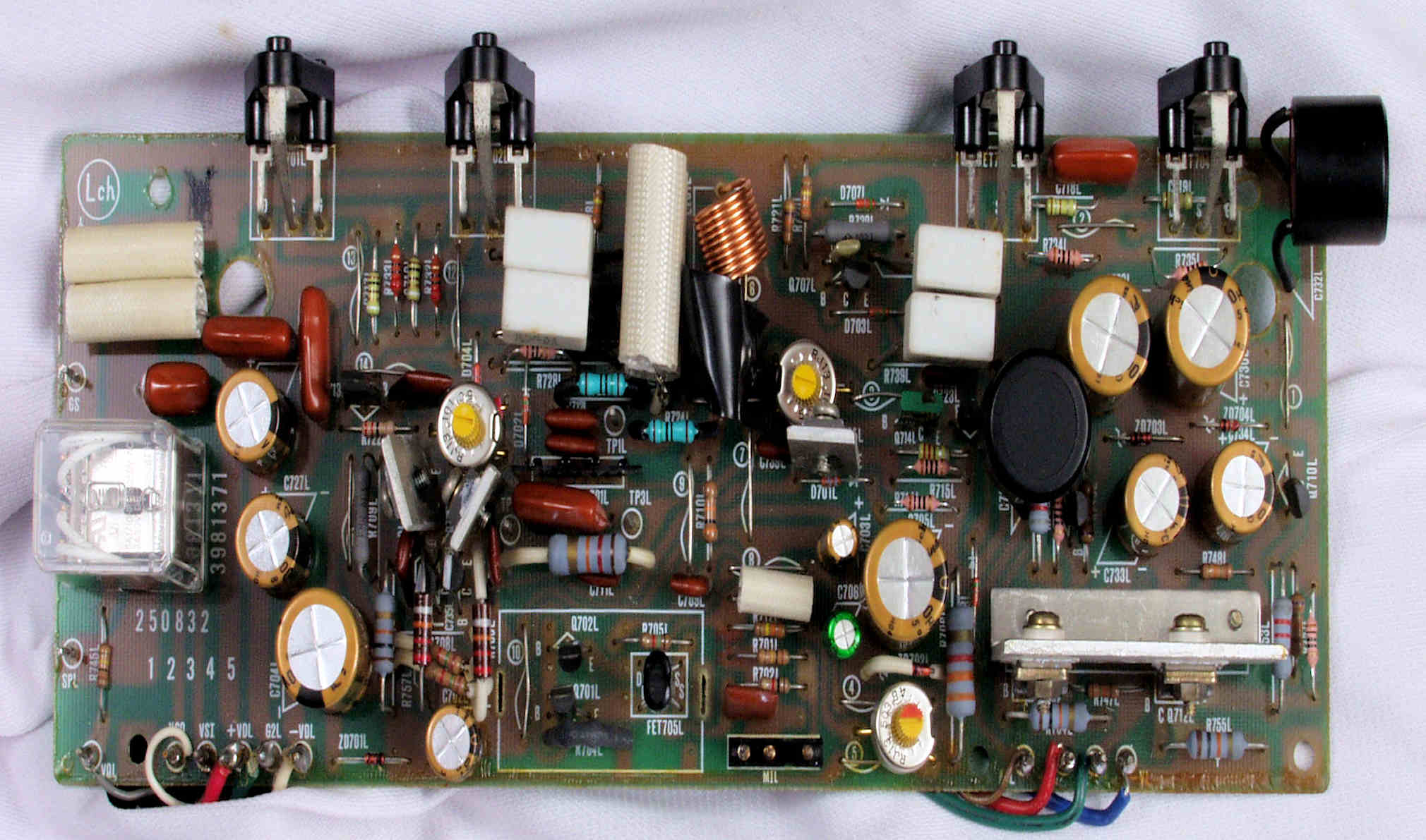 | C22. 修理後 L側ドライブ基板 初段FET(電界効果トランジスター)、バランス/バイアス調整用半固定VR3個、SP接続リレー交換 フューズ入り抵抗全部、電解コンデンサー11個交換 |