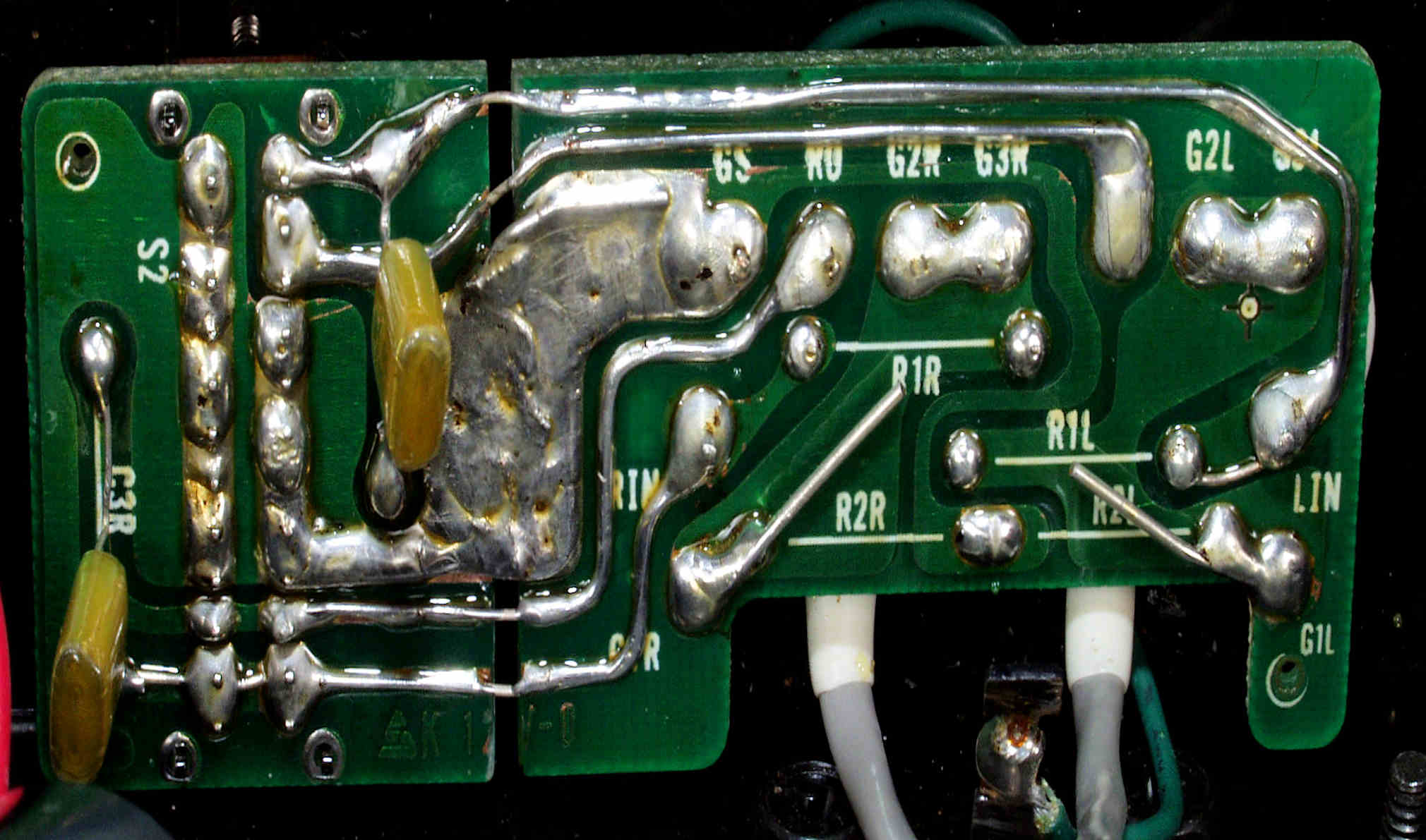 | C68. 修理(半田補正)後 RCA端子基板裏 半田を全部やり直す フイルムコンデンサー2個交換、2個増設 |