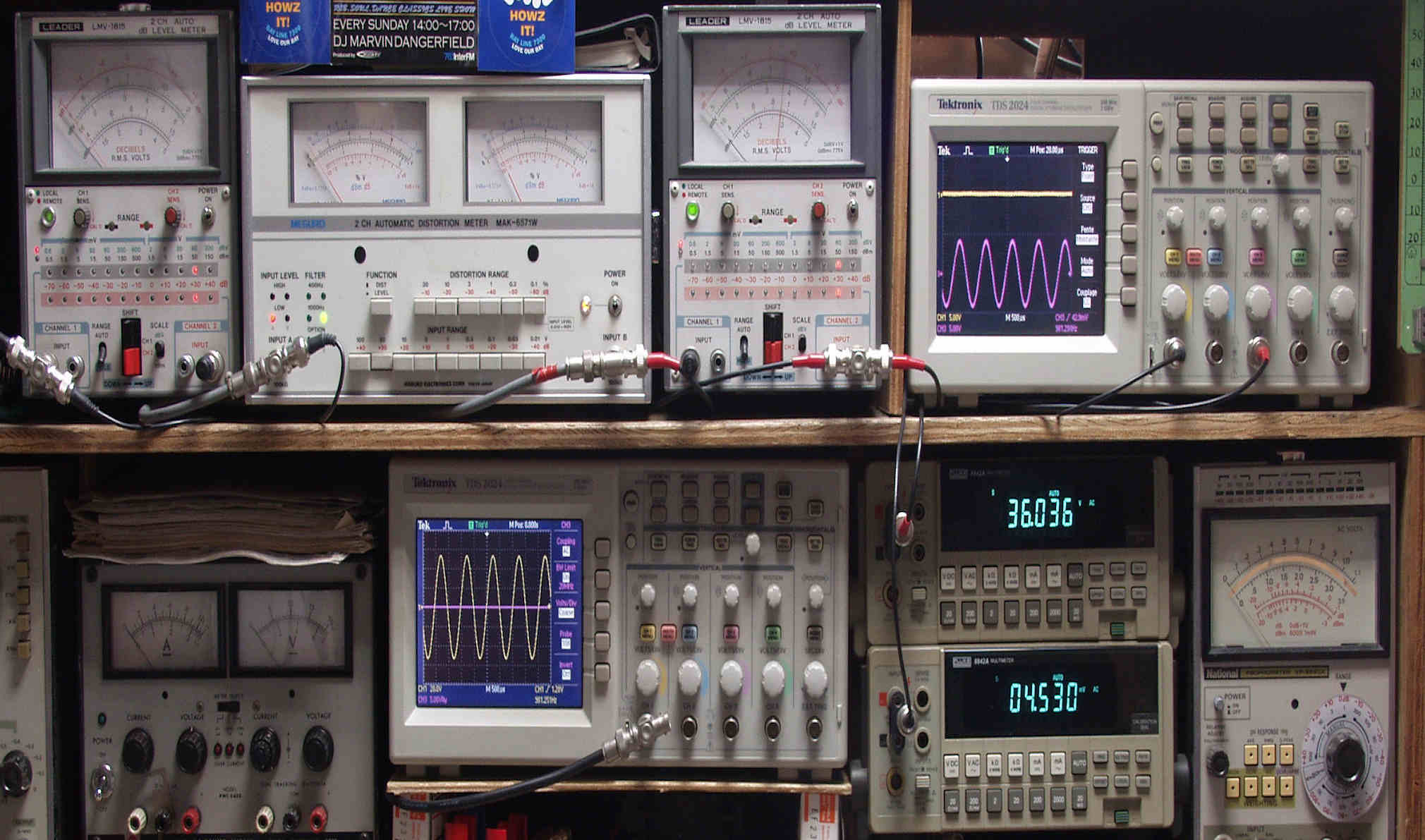 | E. 調整・測定 E11. 出力/歪み率測定・調整 「見方」。 下段左端 オーディオ発振器より400HZ・1KHZの信号を出し(歪み率=約0.003%)これをAMPに入力し、出力を測定。 下段中央 オシロ=入力波形(オーディオ発振器のTTLレベル表示)。 上段左端 交流電圧計=L側出力電圧測定、黒針のみ使用。 上段中左 歪み率計=出力の歪み率測定 左メータ=L出力、右メータ=R出力。 上段中右 交流電圧計=R側出力電圧測定、赤針のみ使用。 上段右端 オシロ=出力波形表示、 赤表示=R出力、黄色表示=L出力。(実際にはRL交流電圧計の出力「Max1V」を観測)。 下段中右上 デジタル電圧計=R出力電圧測定。 下段中右下 デジタル電圧計=L出力電圧測定。 |