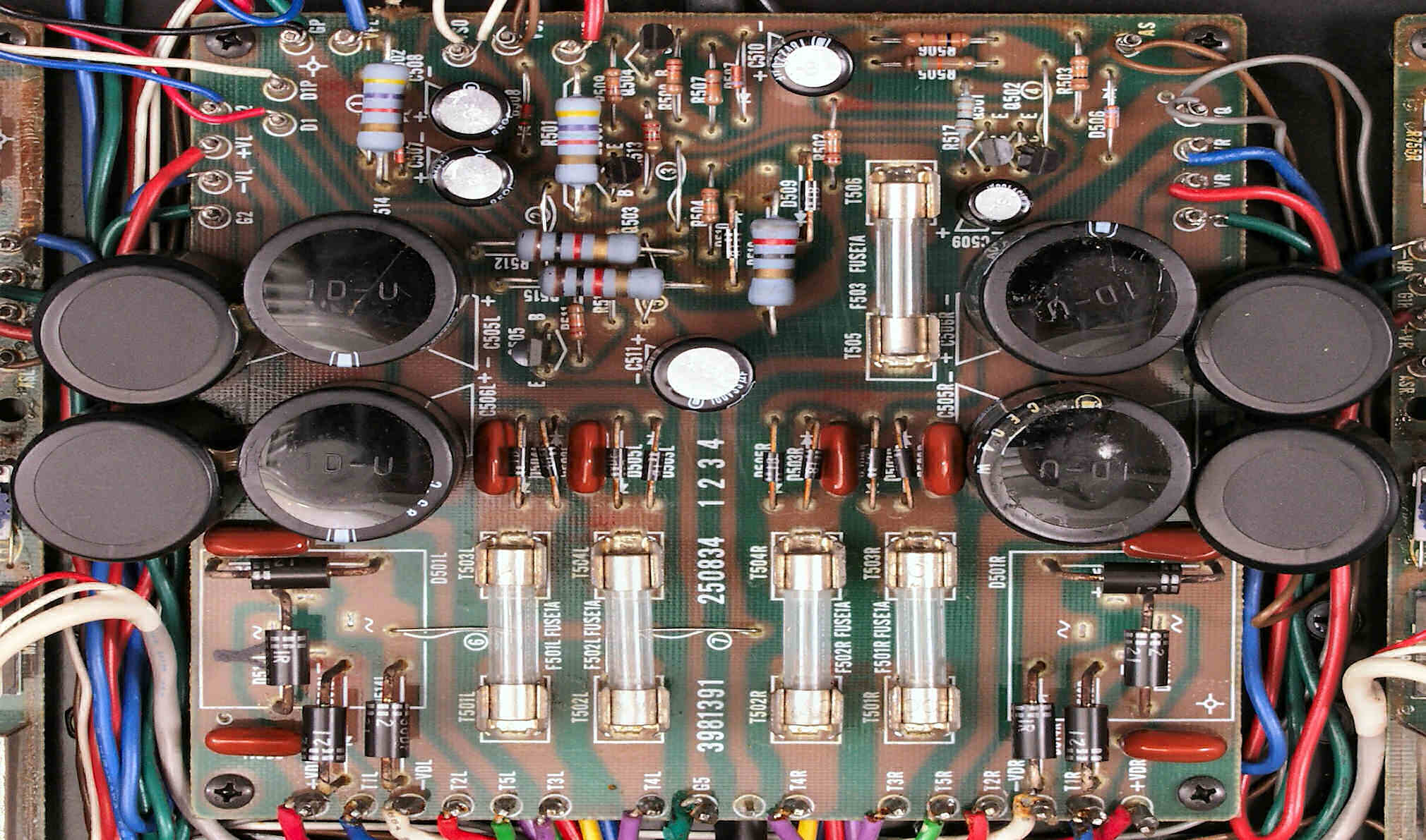 | C52. 修理後 電源基盤 フューズ入り抵抗全部、電解コンデンサー9個、整流ダイオード10個交換、輪ゴムは接着材が固まるまで使用 |