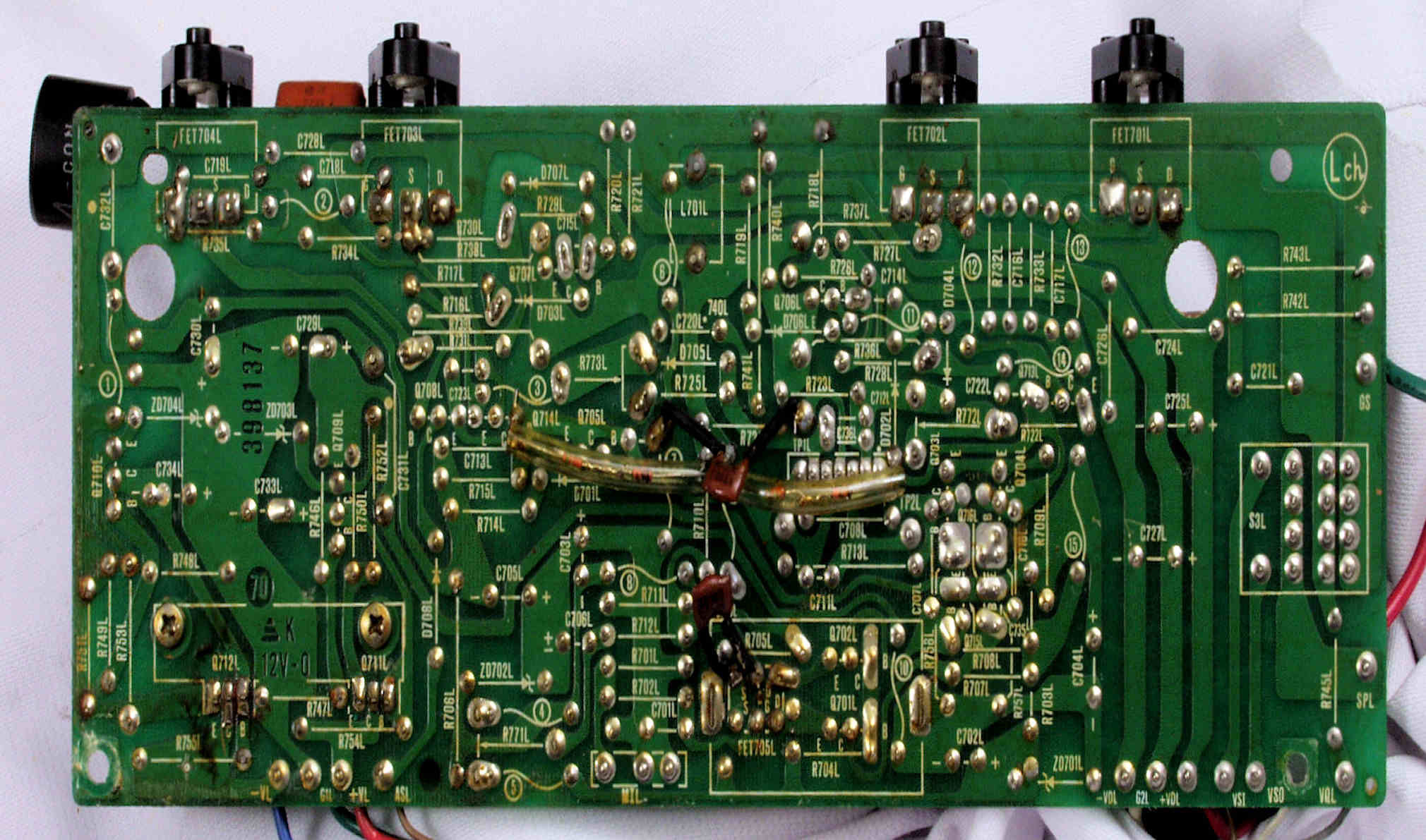 | C131. 修理中 R側ドライブ基板裏、不使用電極ですが、穴あきは半田不良では最悪。 |