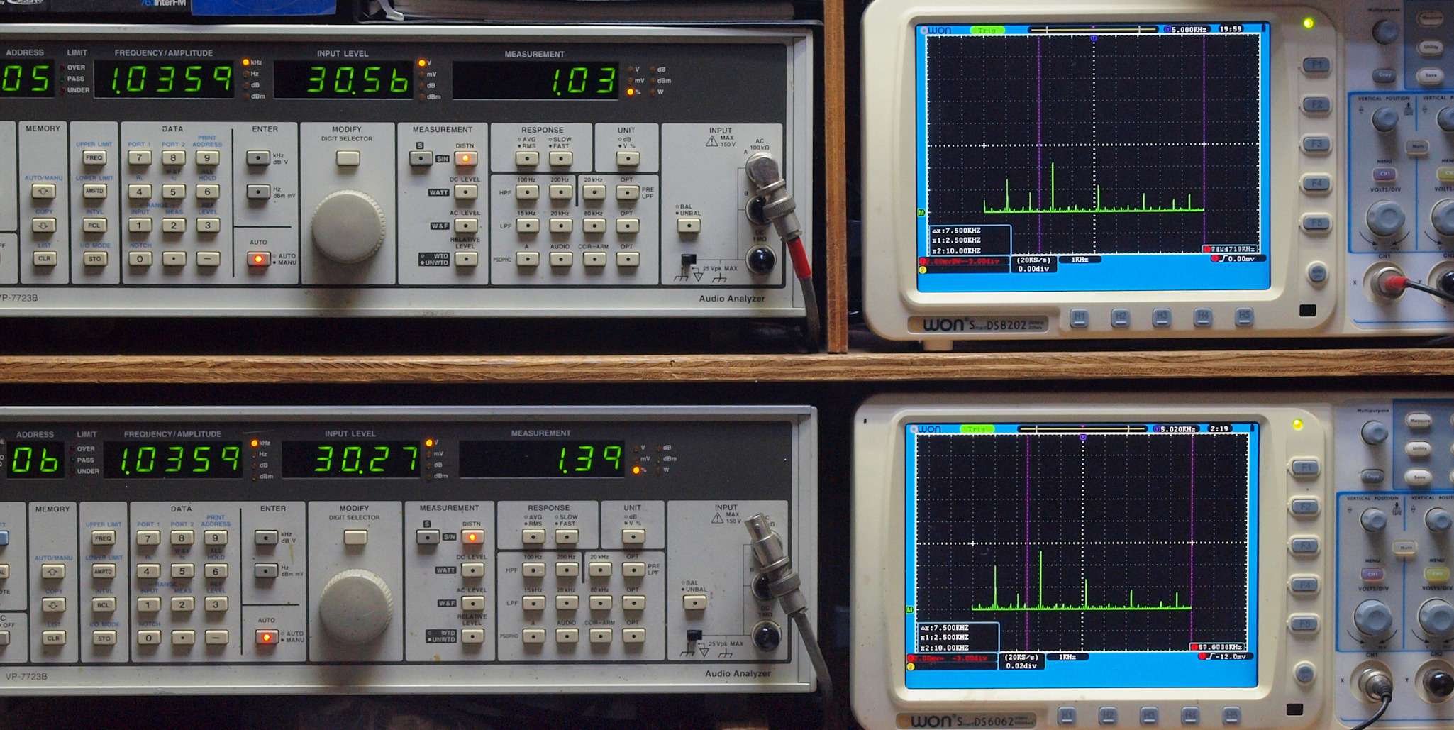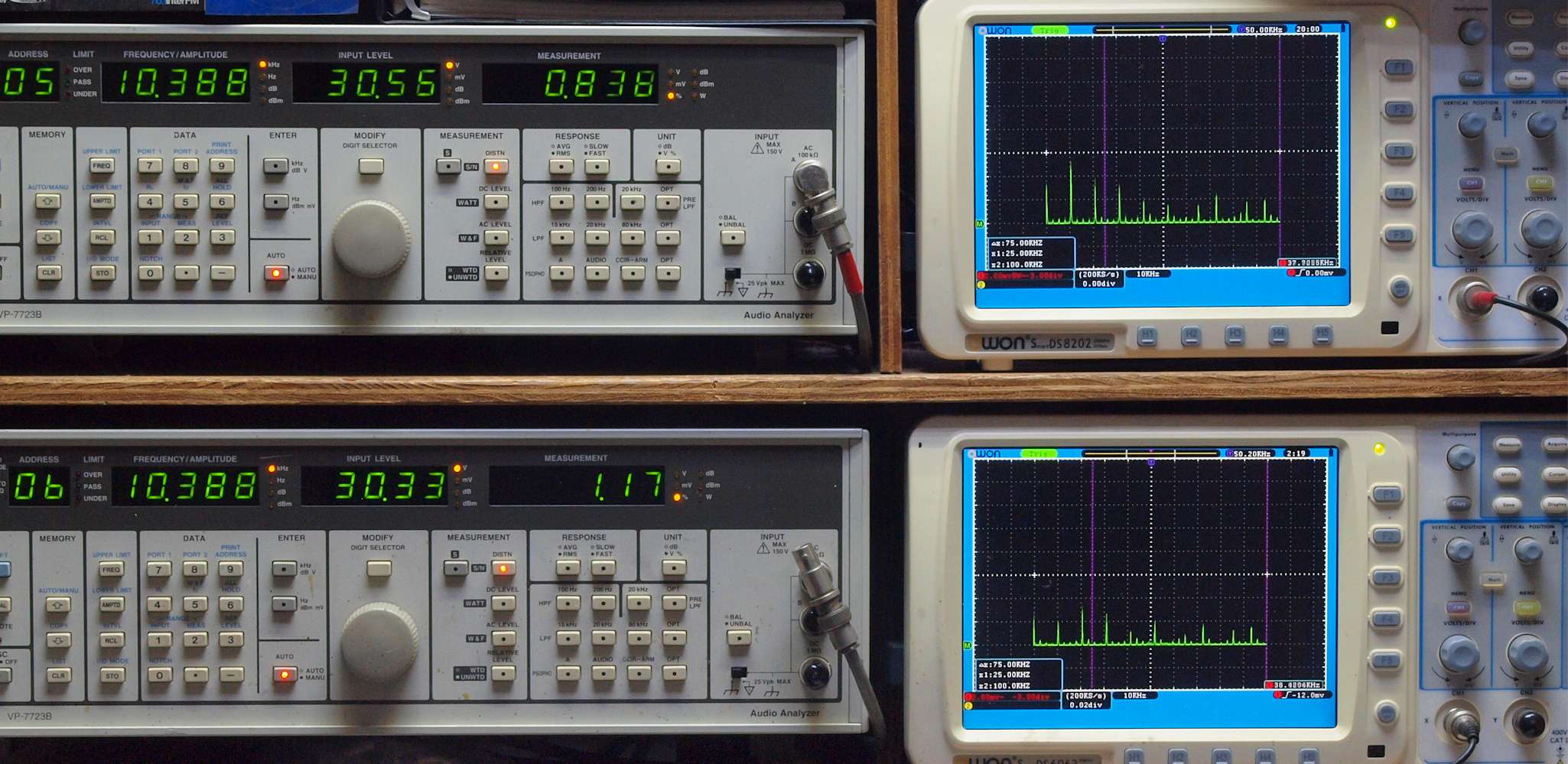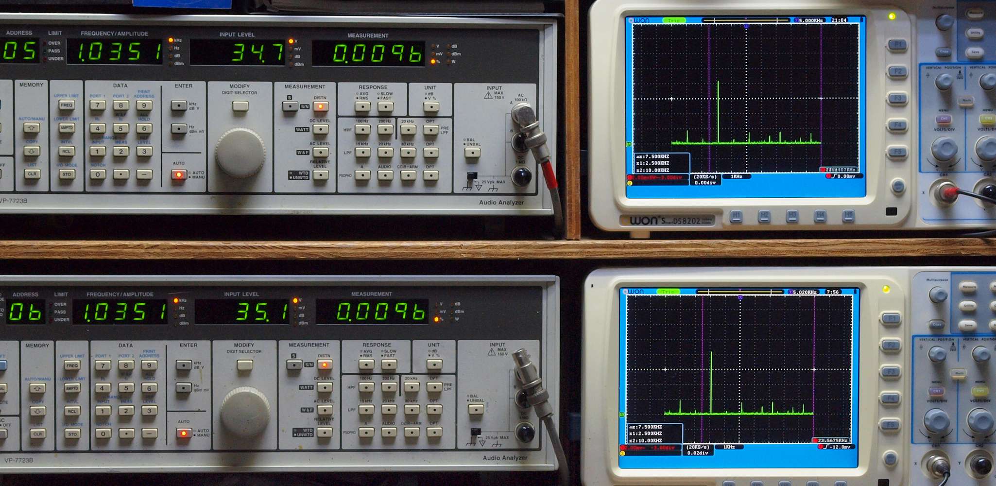 | E. 測定・調整。 画像をクリックすると、大きく(横幅2050ドット)表示されます。 E1. 出力・歪み率測定・調整 「見方」。 上段中 右側SP出力を「Audio Analyzer Panasonic VP−7723B」により測定。 表示LED、 左端=メモリーNo、 中左=周波数測定、 中右=出力電圧測定、 右端=歪み率測定。 上段右端 VP−7723Bの基本波除去出力を「owon SDS8202(200MHZ)」で「FFT分析」表示。 下段中 左側SP出力を「Audio Analyzer Panasonic VP−7723B」により測定。 表示LED、 左端=メモリーNo、 中左=周波数測定、 中右=出力電圧測定、 右端=歪み率測定。 下段右端 VP−7723Bの基本波除去出力を「owon SDS6062(200MHZ)」で「FFT分析」表示。 下段左端 オーディオ発振器 VP−7201A より50Hz〜100kHzの信号を出し(歪み率=約0.003%)、ATT+分配器を通し、AMPに入力。 よって、ダイアル設定出力レベルより低なります。測定機器の仕様や整備の様子はこちら、「VP−7723B」「VP−7201A」。 FFT画面の見方はこちら。 |