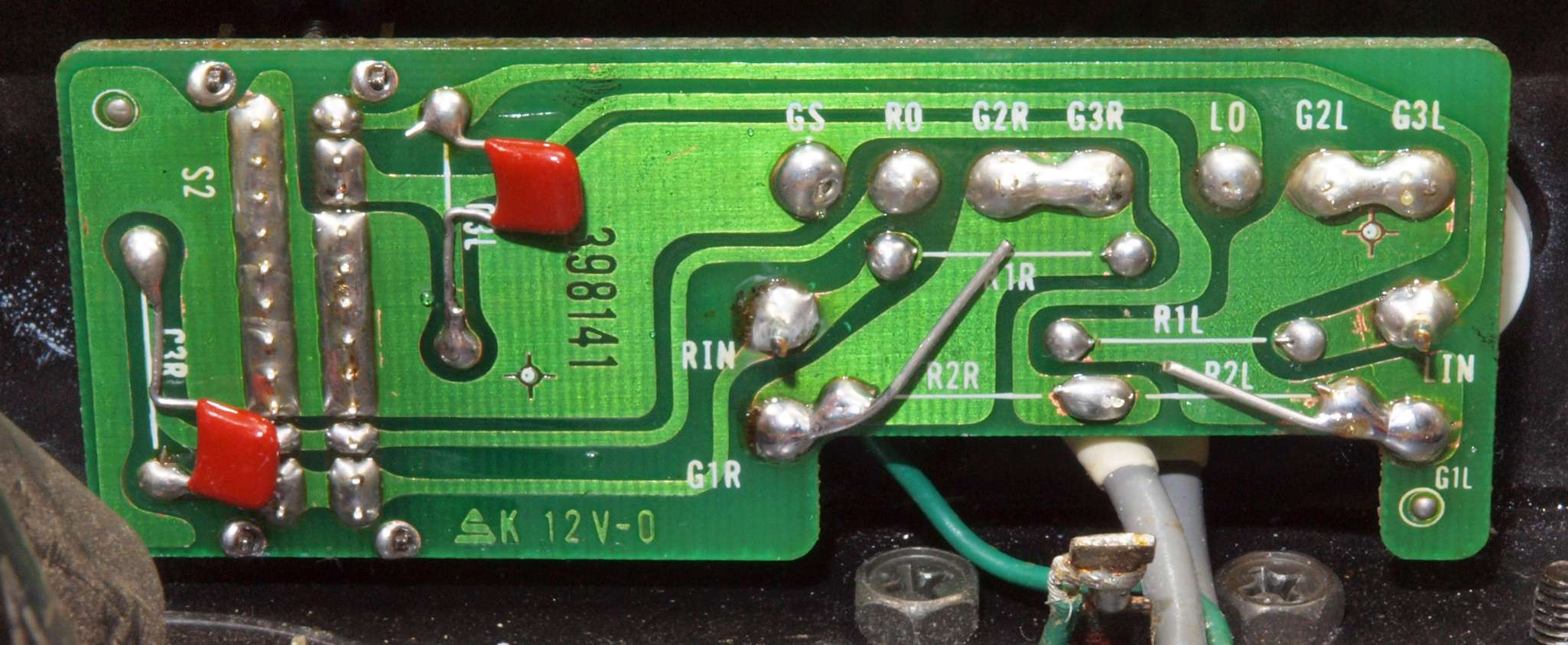 | C6A. 修理(半田補正)後 RCA端子基板裏 半田を全部やり直す フイルムコンデンサー2個増設 |