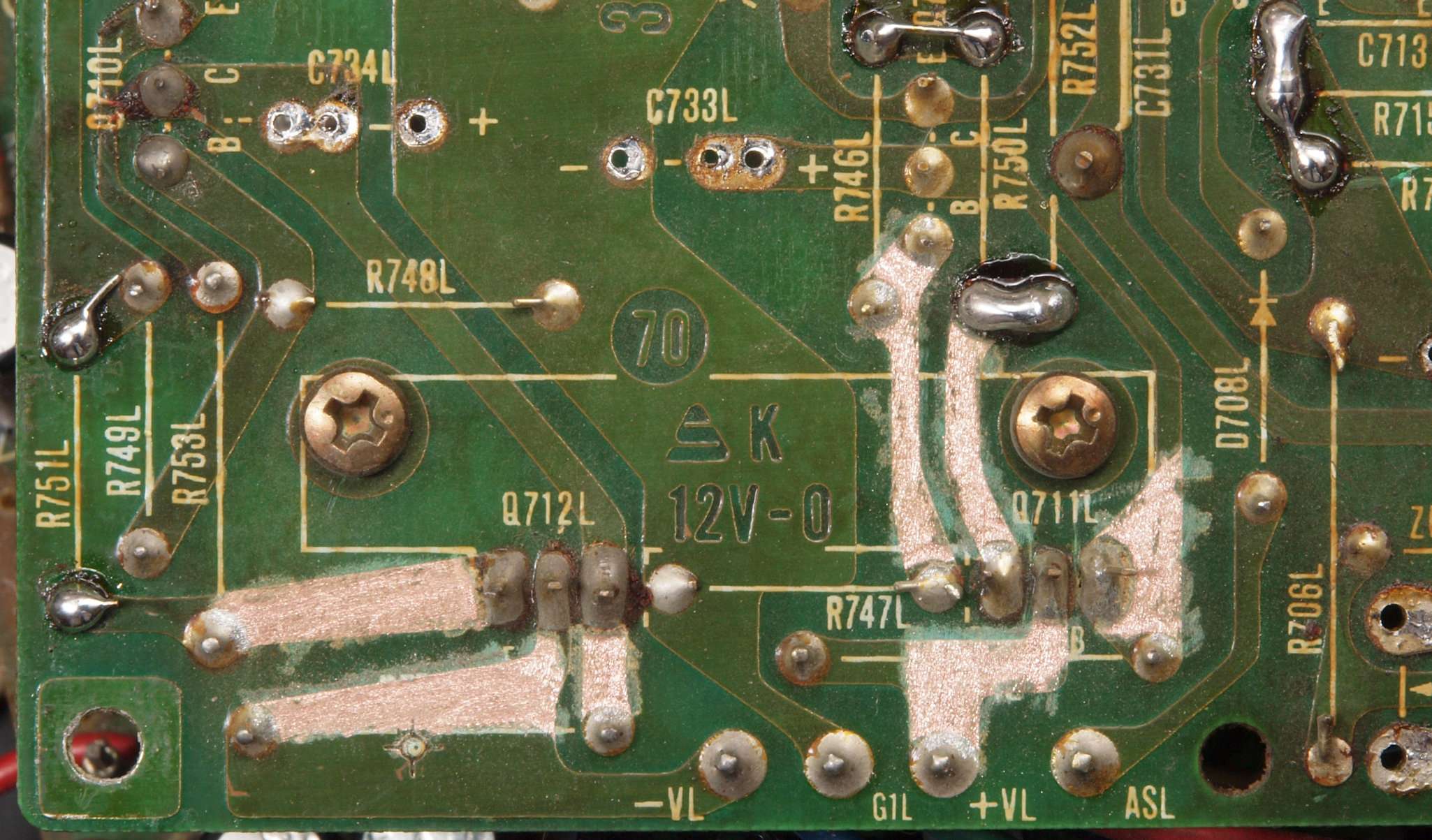 | C24. 修理中 L側ドライブ基板裏 定電圧TR(トランジスター)の足の銅箔を広げる。 |